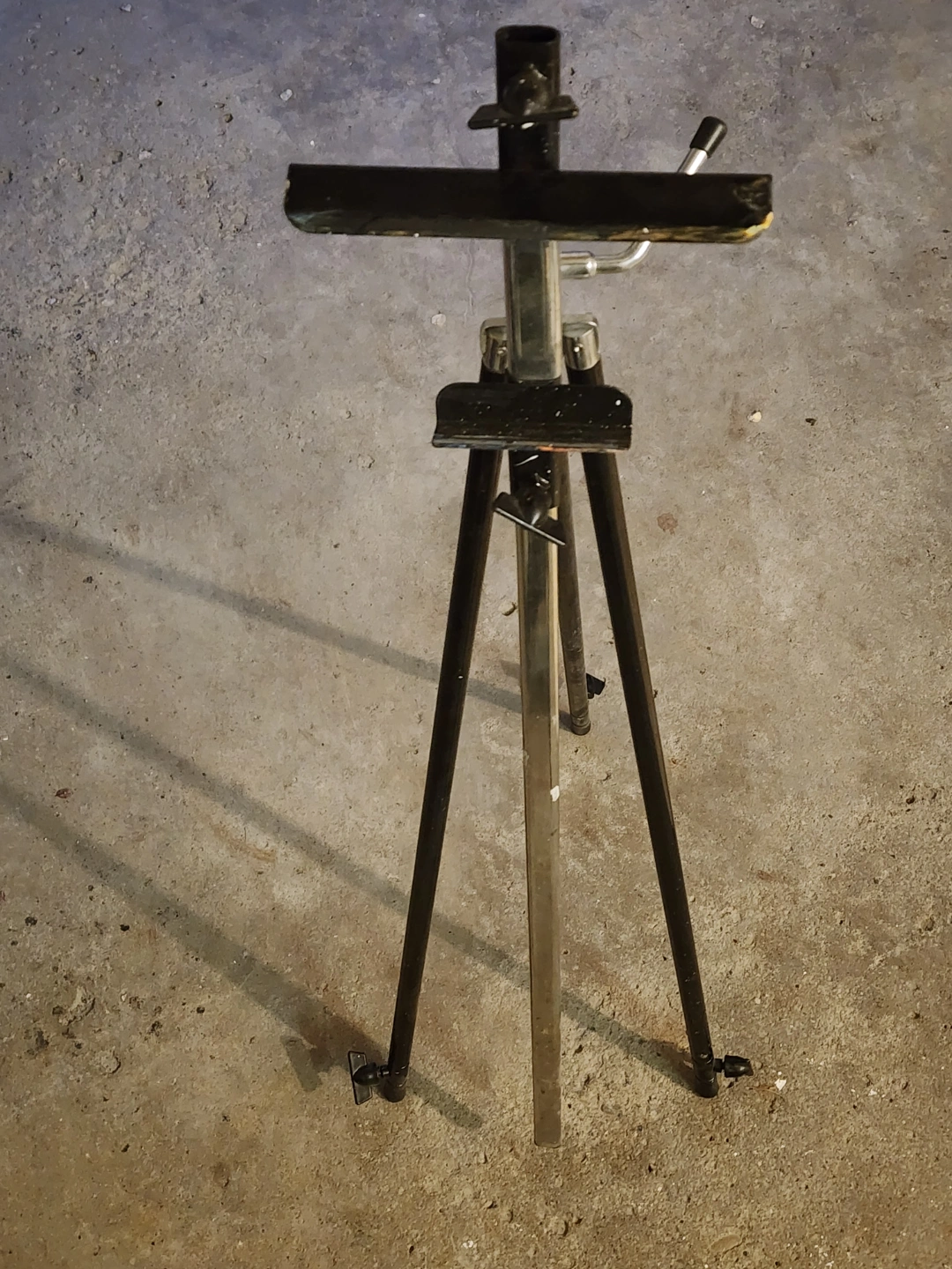 Tripod base with adjustable height. Metallic vertical post. Crossbar with a small black handle. A great companion for finding a state of calm while painting your next creation.