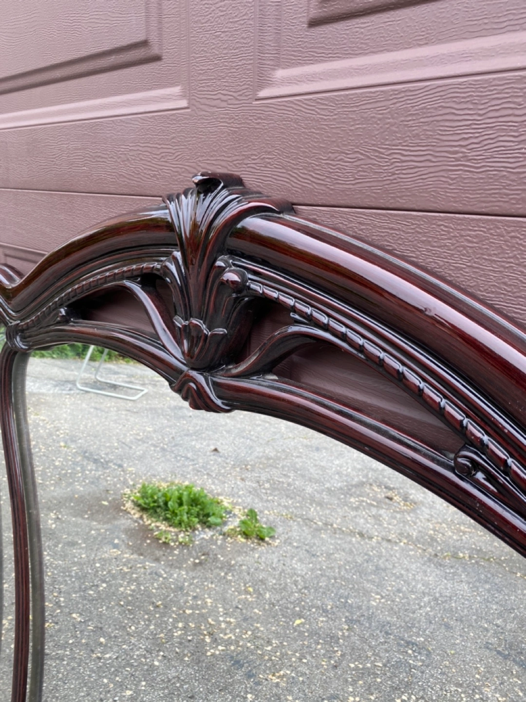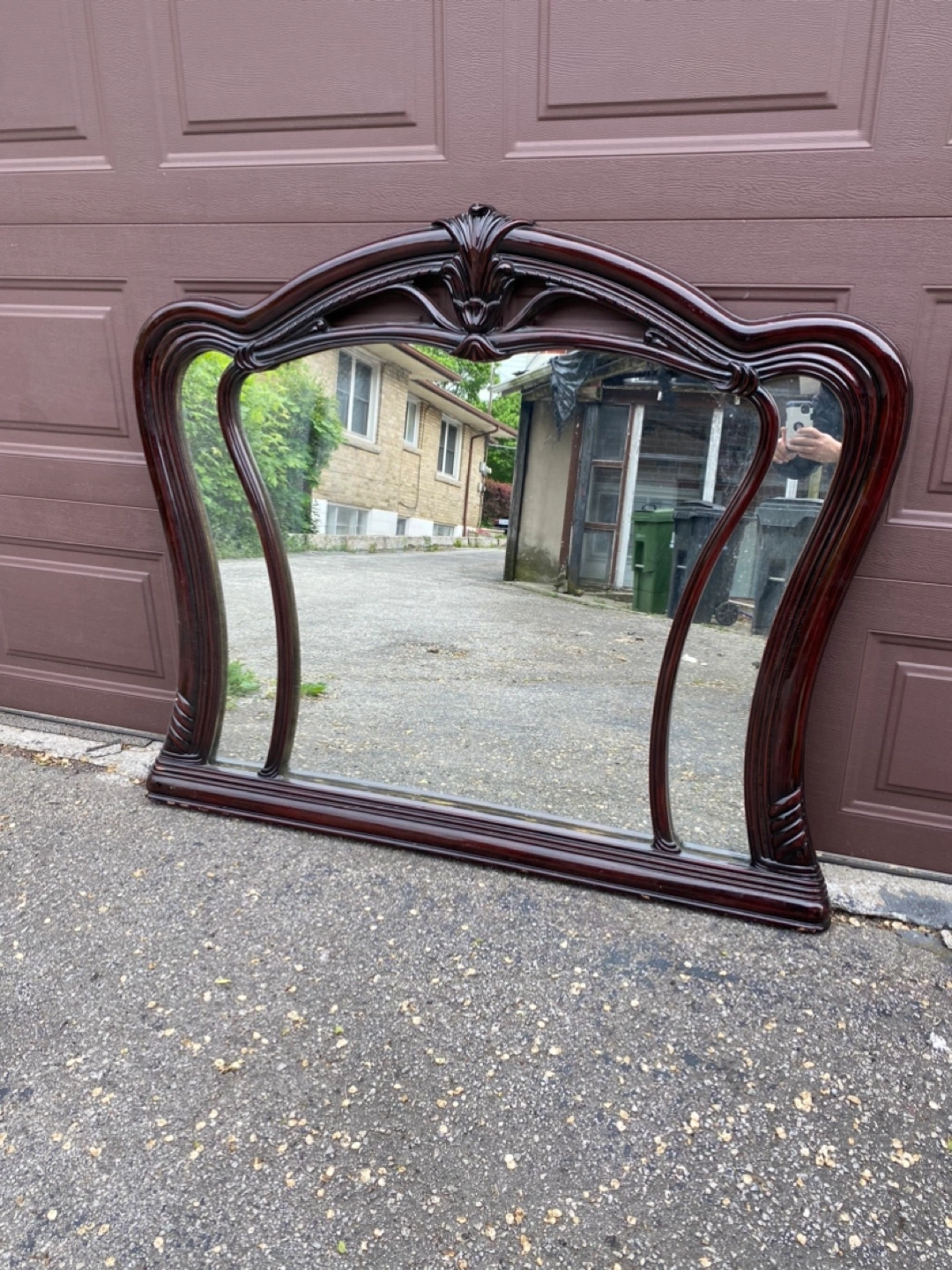 Large mirror headboard for a double sized bed. Dark wood frame. Ornate detailing at the top. You could set this mirror in a beautiful room to create a relaxing space. Can be picked up any weekday or delivered to your place on the weekend.