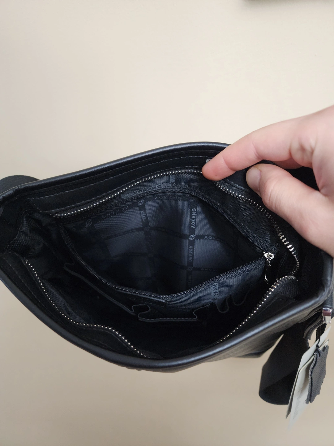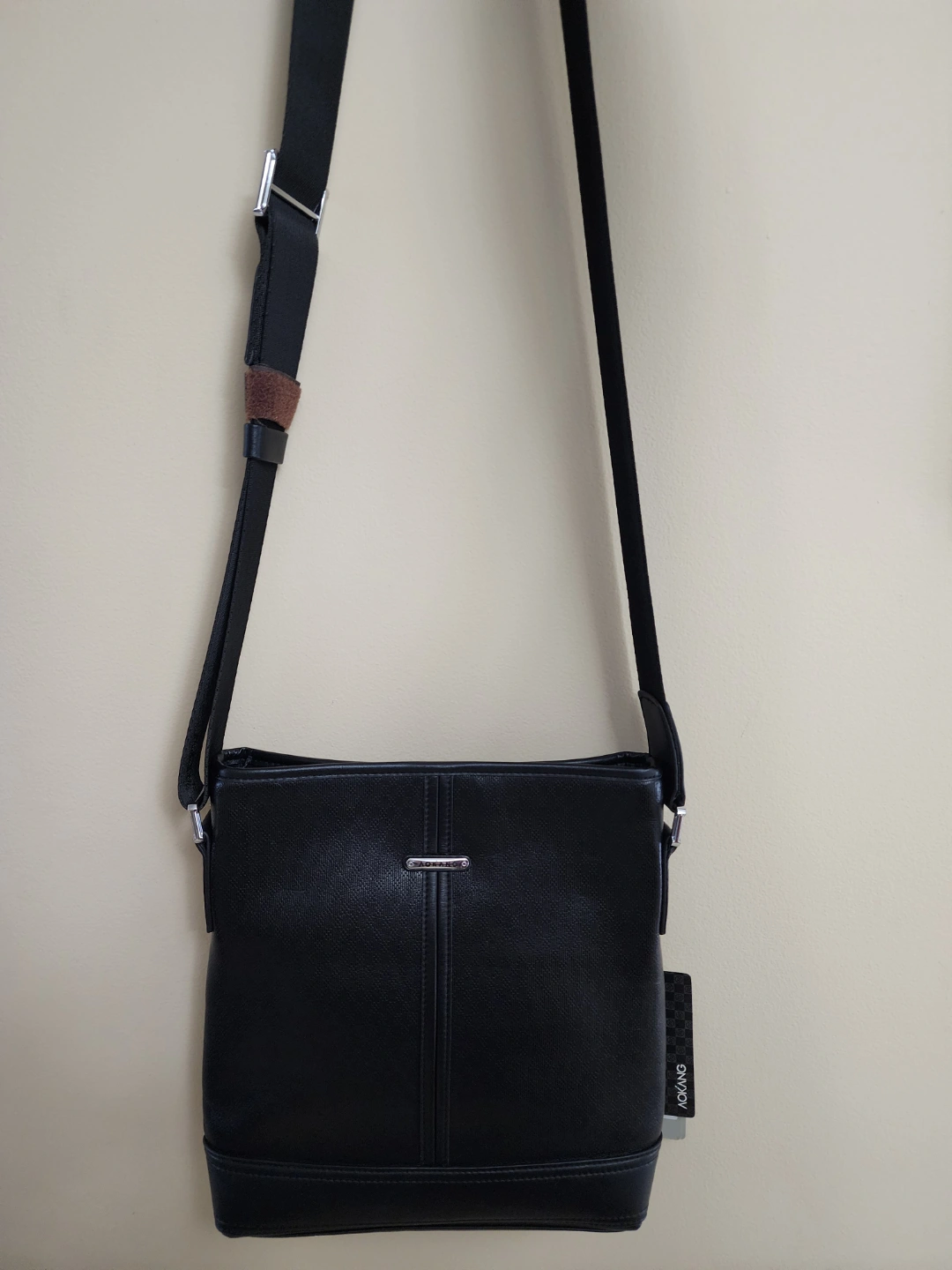 A sleek NEW black leather shoulder bag. Featuring a shoulder strap. The bag features a zippered closure. Multiple pockets inside. This bag would be a great addition for carrying all your essentials while feeling calm.