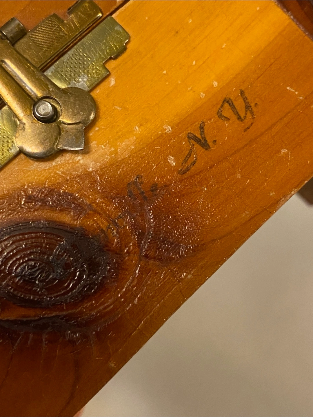 Wooden box with a hinged lid. Hand-painted image of a woman in a dress on the lid. Metal clasp. Would be the perfect place to store your most precious keepsakes. Vintage. Made in Canada Each box is 20$