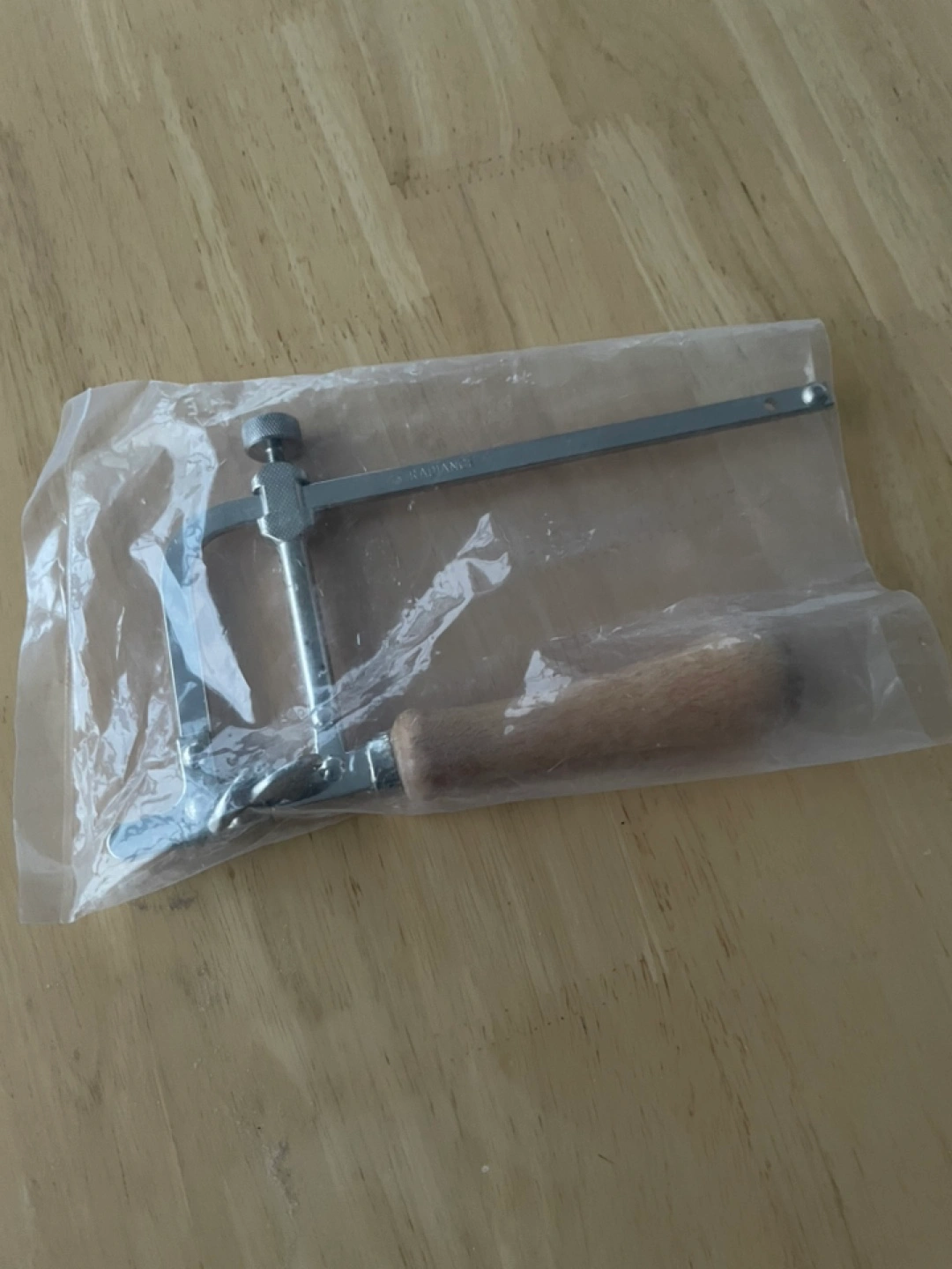 Saw for jewellers, in its original packaging. The saw has a wooden handle. Working with a saw can be very relaxing.