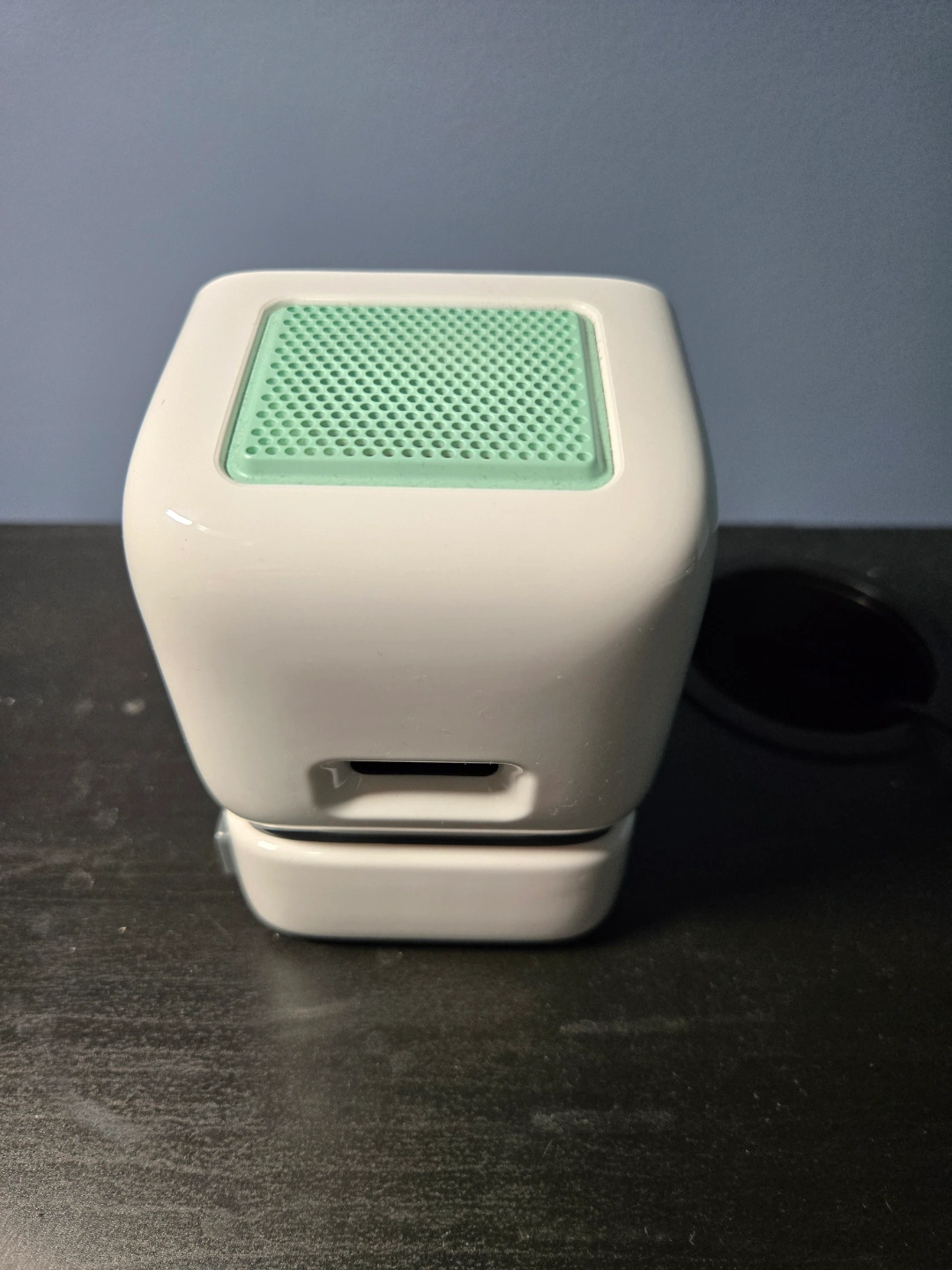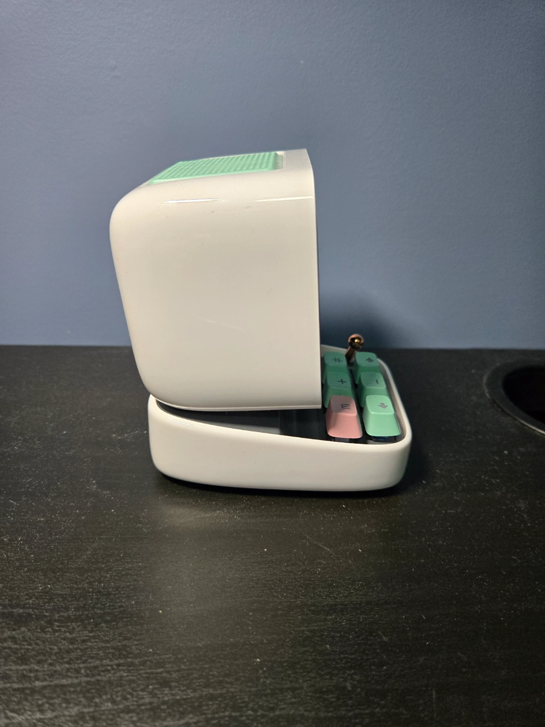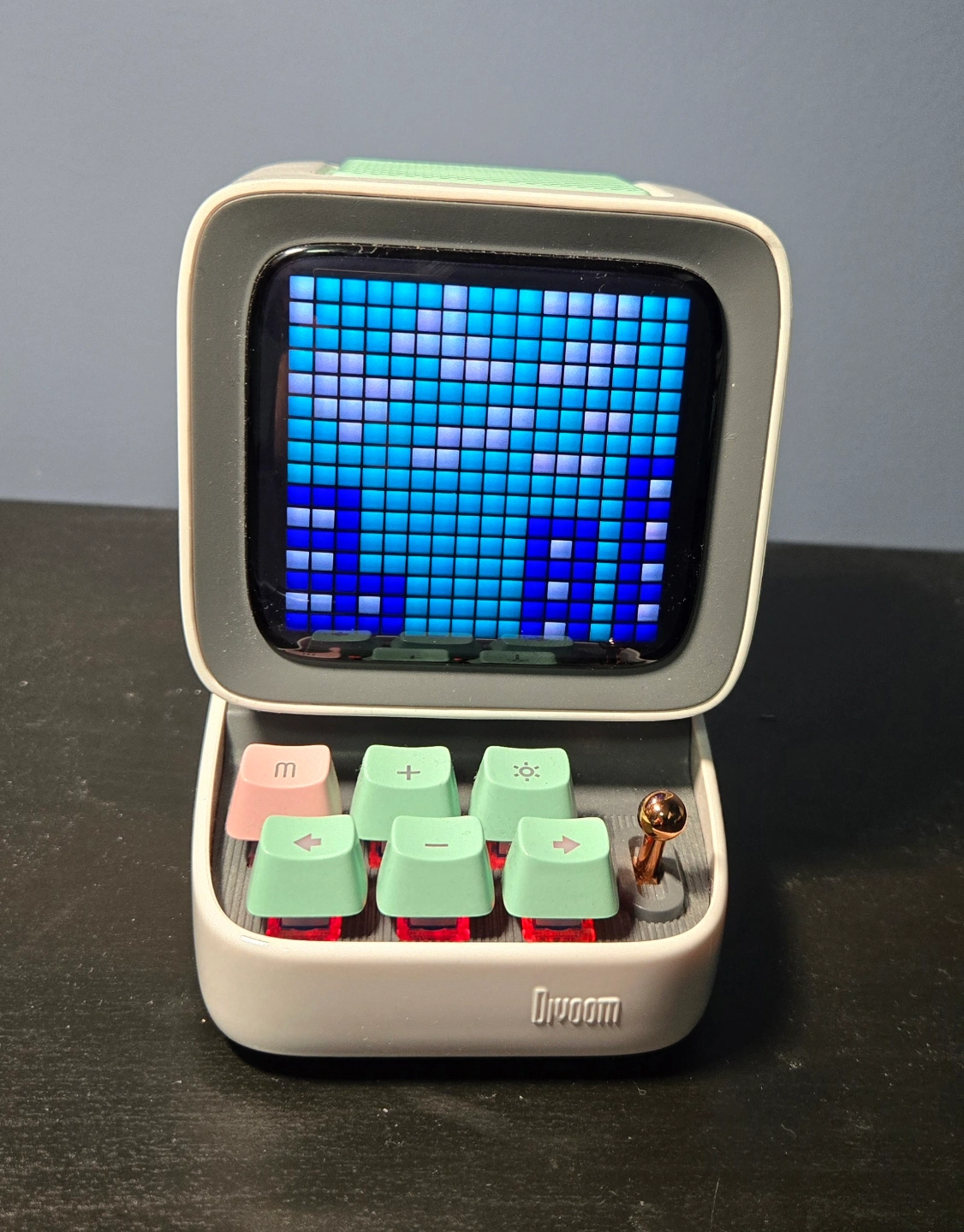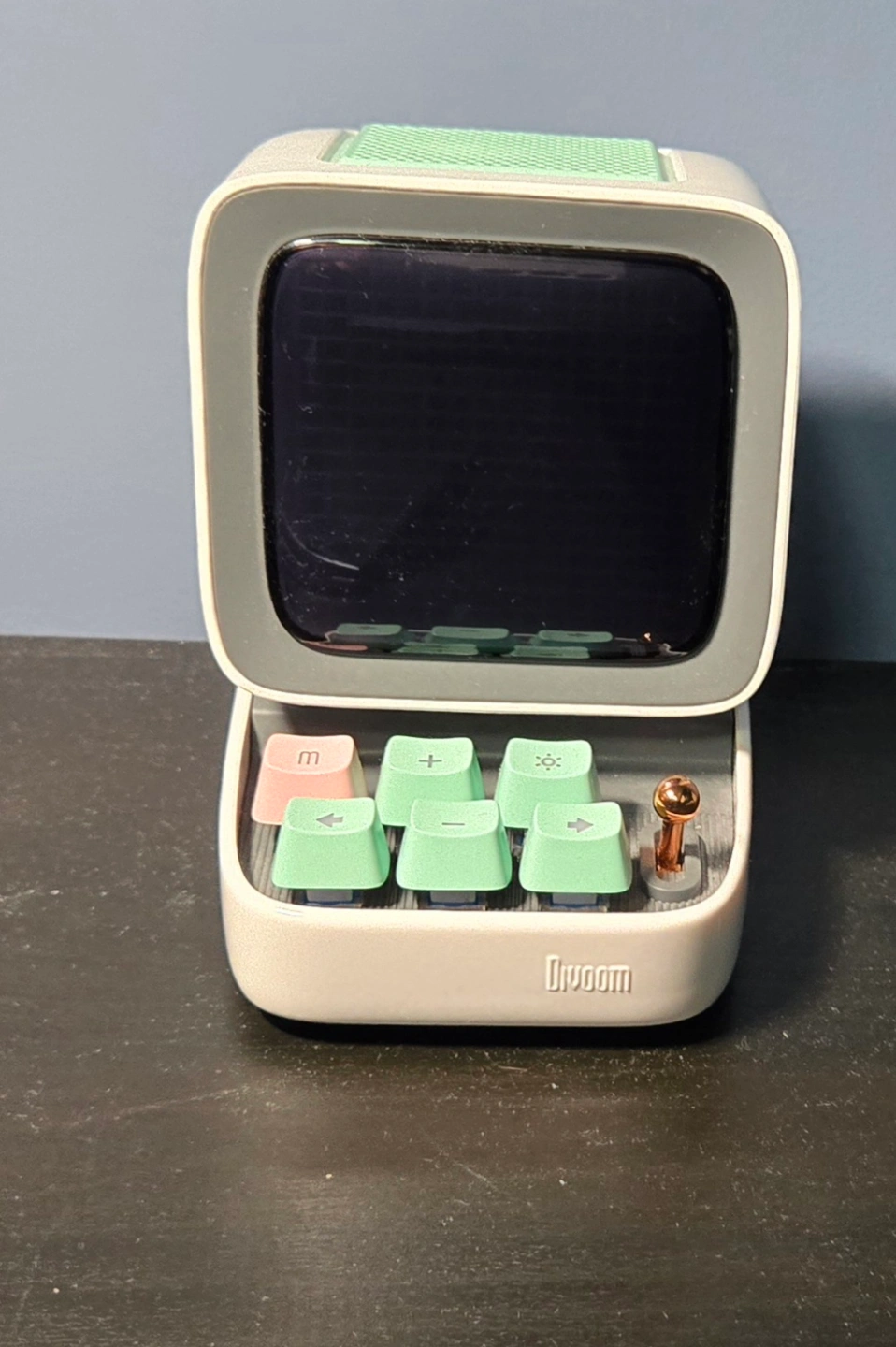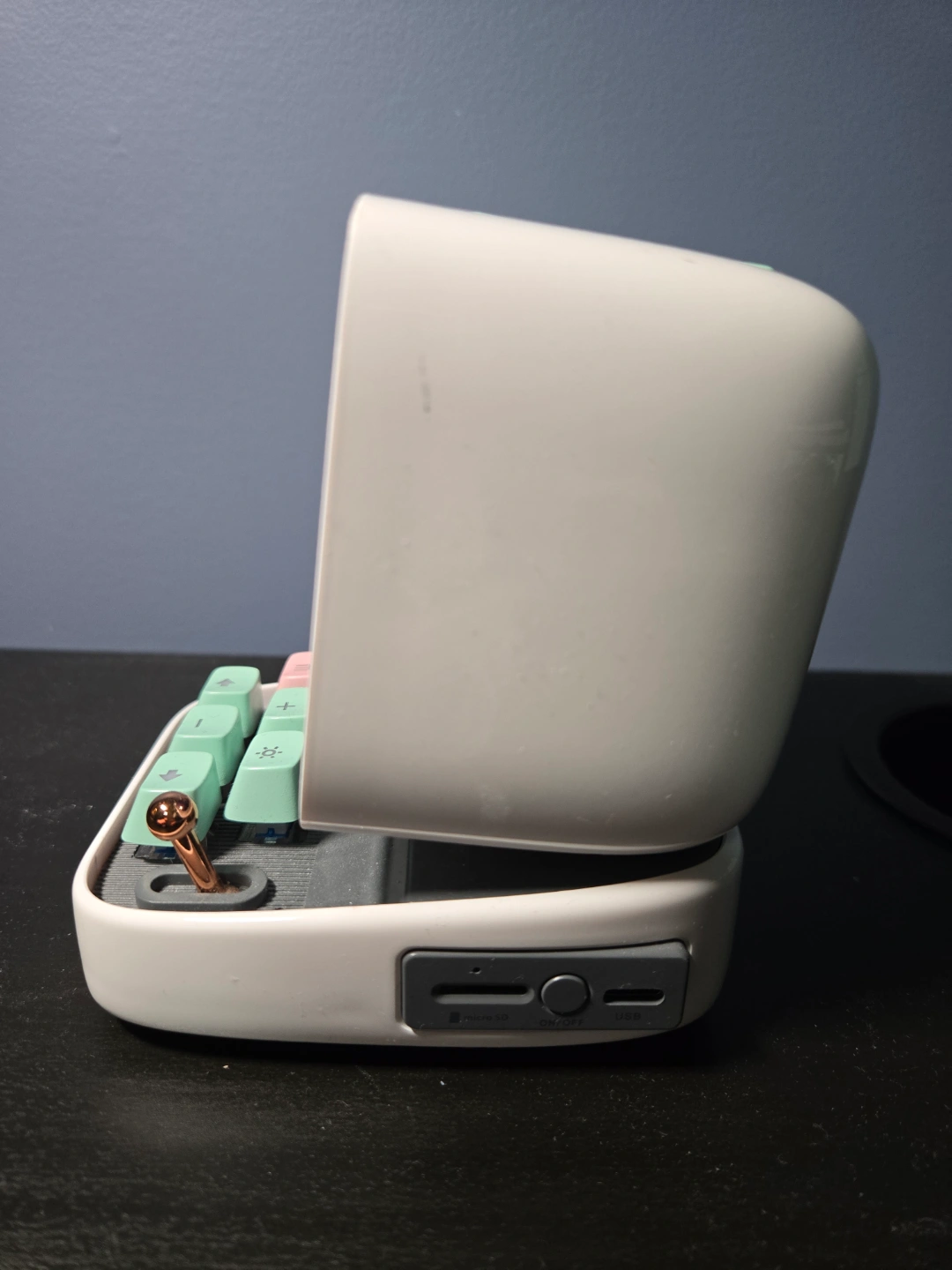 Small, unique device speaker with a screen and colorful keys. Appears to have a retro aesthetic, with a few side ports. The device seems perfect for winding down before bed.