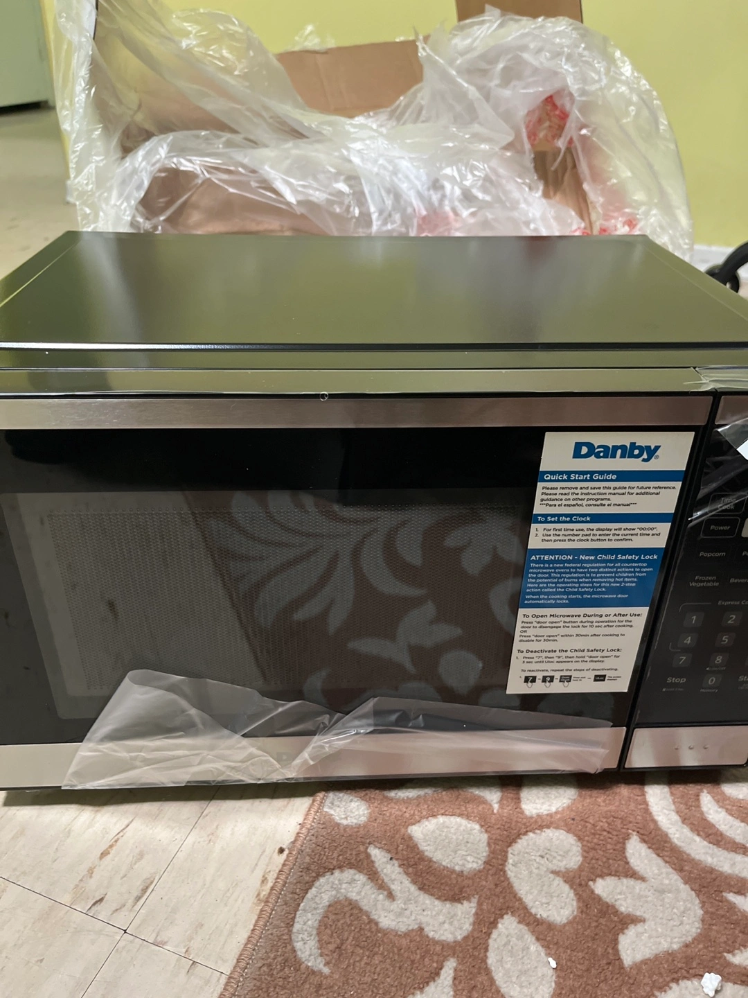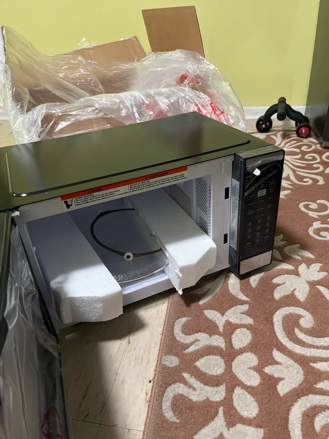 Appliance for heating food, with a black front. It has a digital display and a keypad. A wonderful addition to your kitchen, offering the convenience of quick meals.