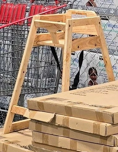 Brand new wooden high chair, designed for a child. Features a seat with a footrest and safety straps. Open box but brand new, never used.