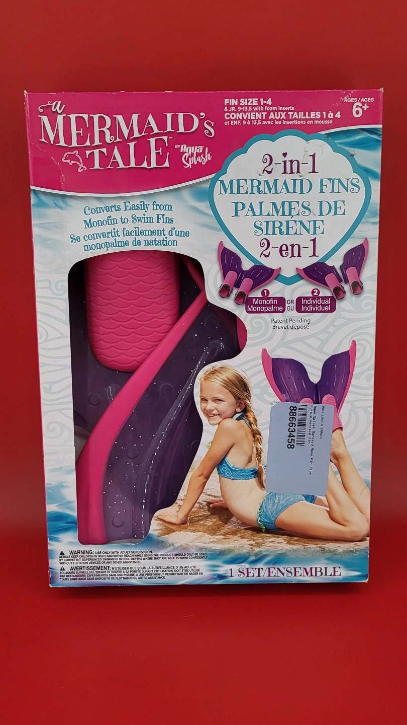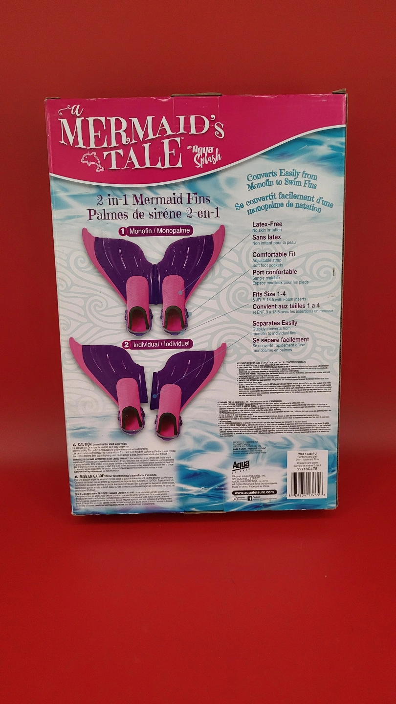 Mermaid fins, in pink and purple colours. Includes a fin size 1-4. Great for anyone looking for fun water activities.