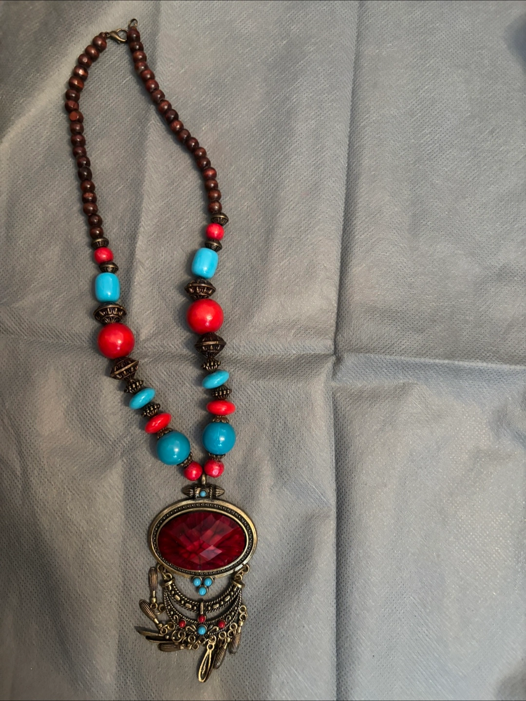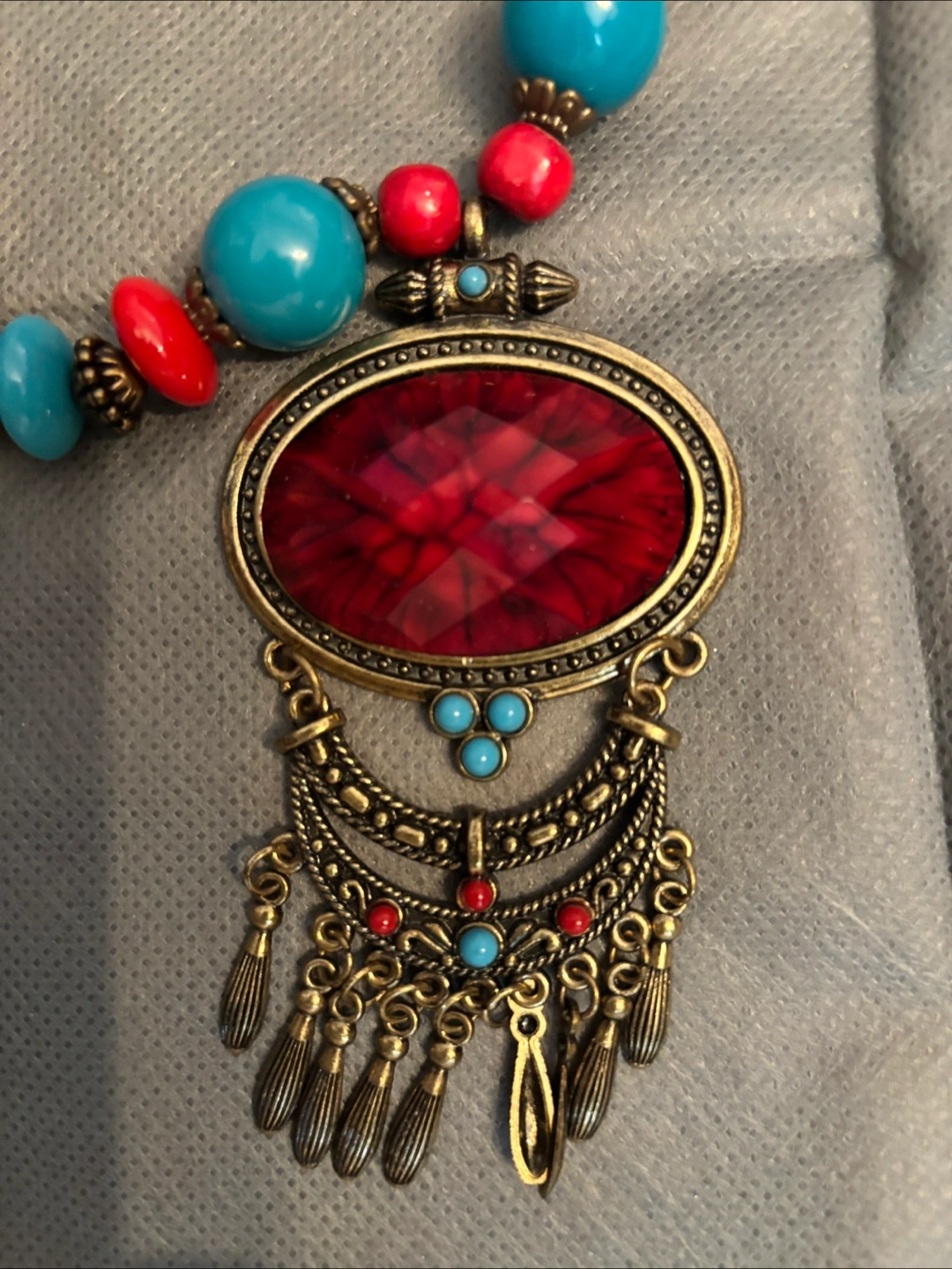 Necklace featuring a combination of beads and a pendant. The pendant has a gemstone design and tassel details. Perfect for adding a touch of whimsy to any outfit.