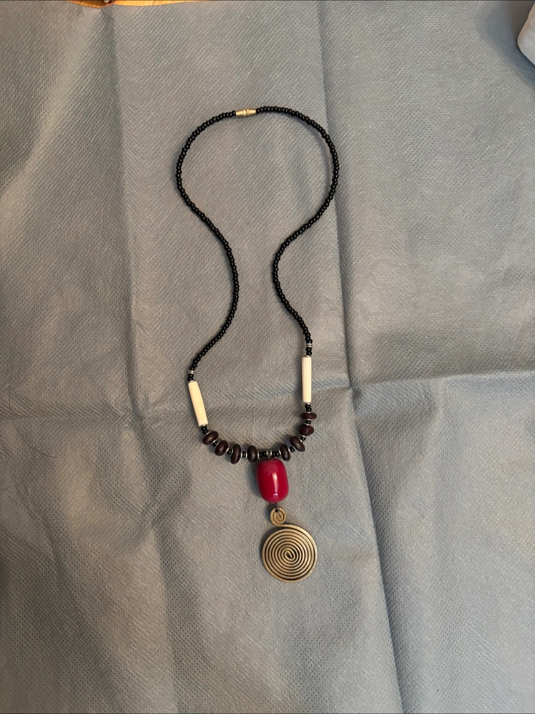 Necklace with black and ivory beads. Red and brown accents. Features a spiral pendant. An elegant necklace to elevate any outfit.