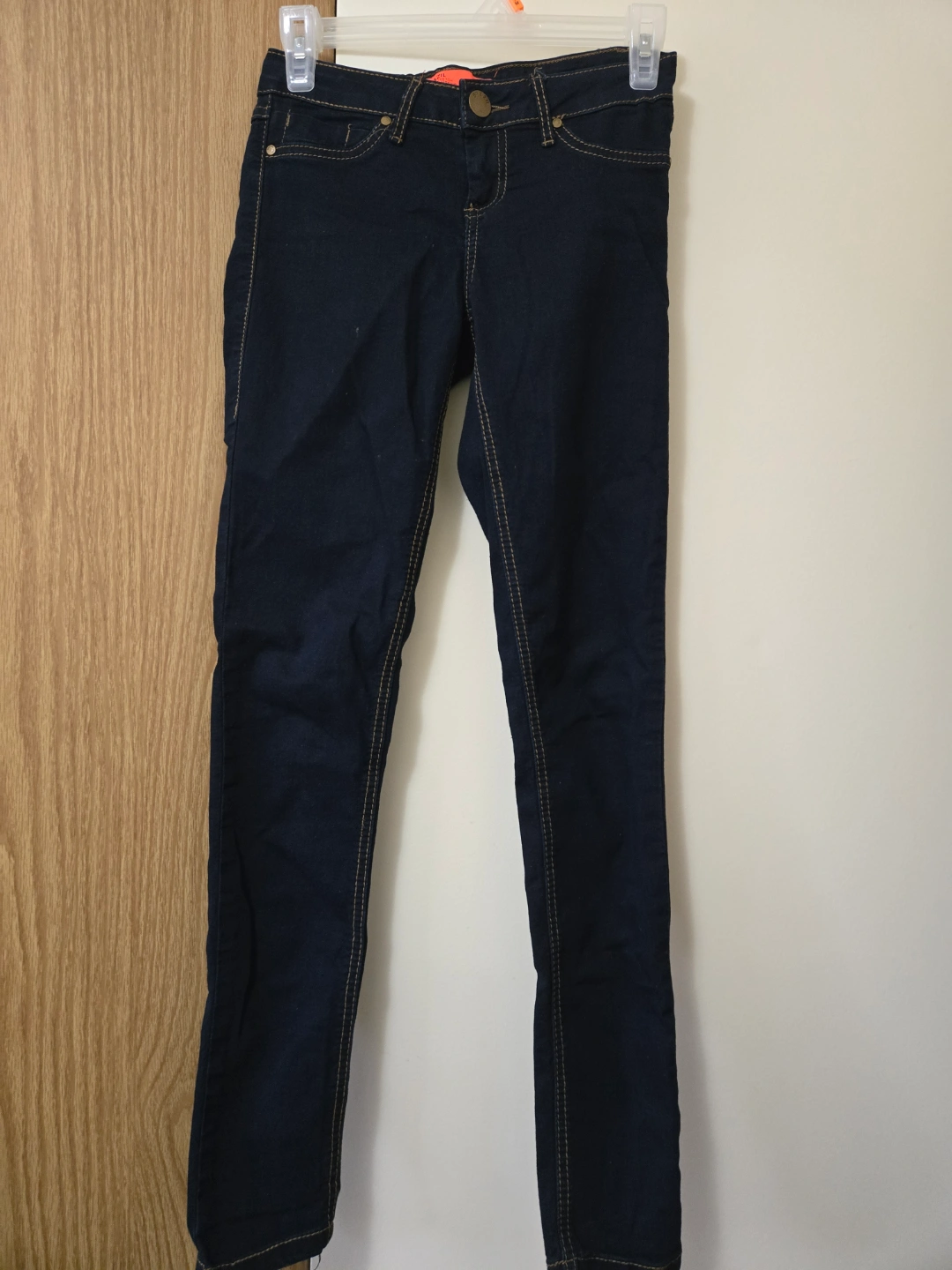Dark wash jeans with a button closure. Contrast stitching. Perfect for a relaxed weekend.