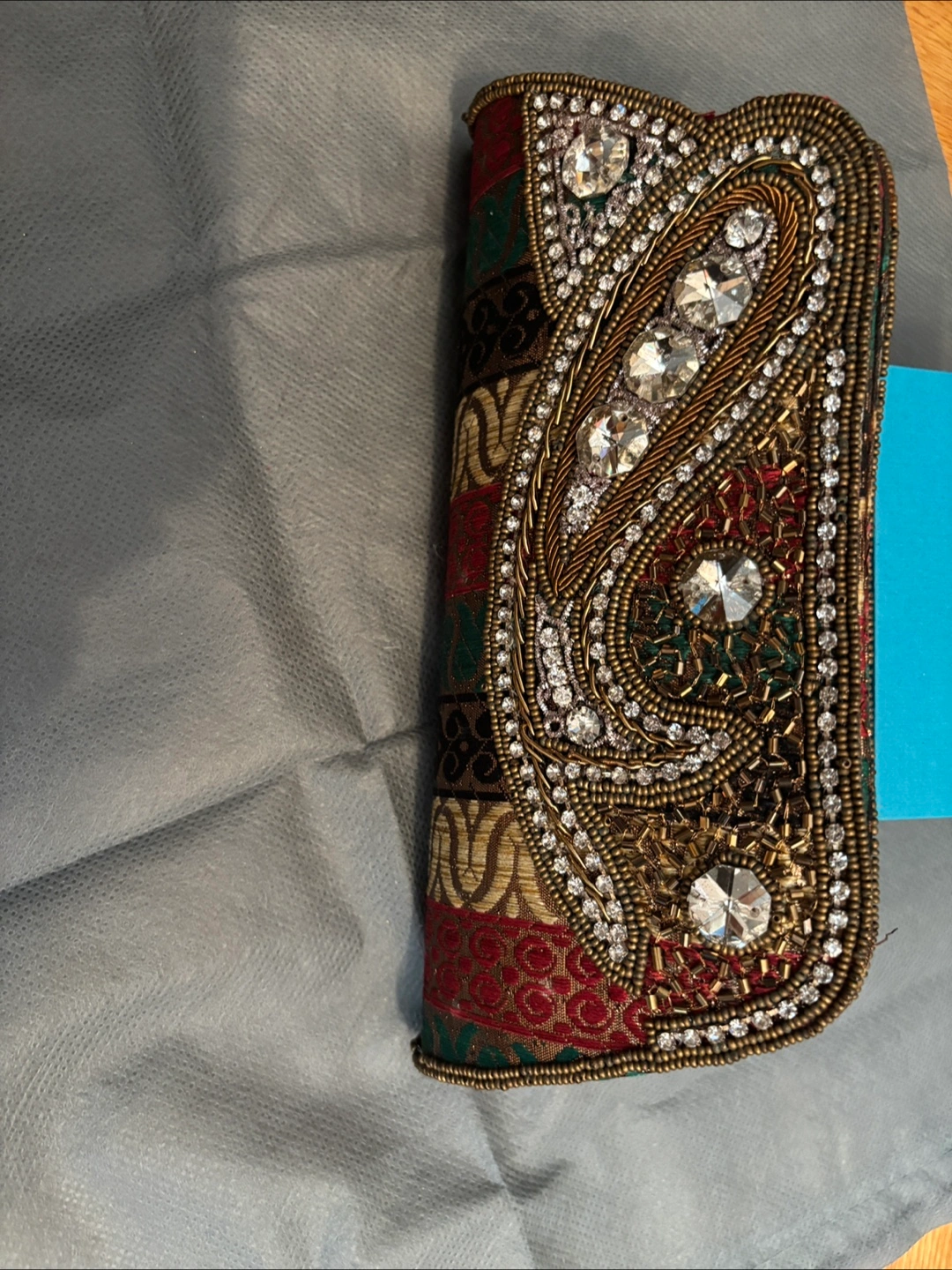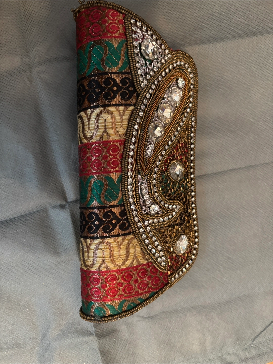 Elaborate clutch purse. Features multicoloured fabric detailing with embellishments. Suitable for special occasions, like a fun night out.