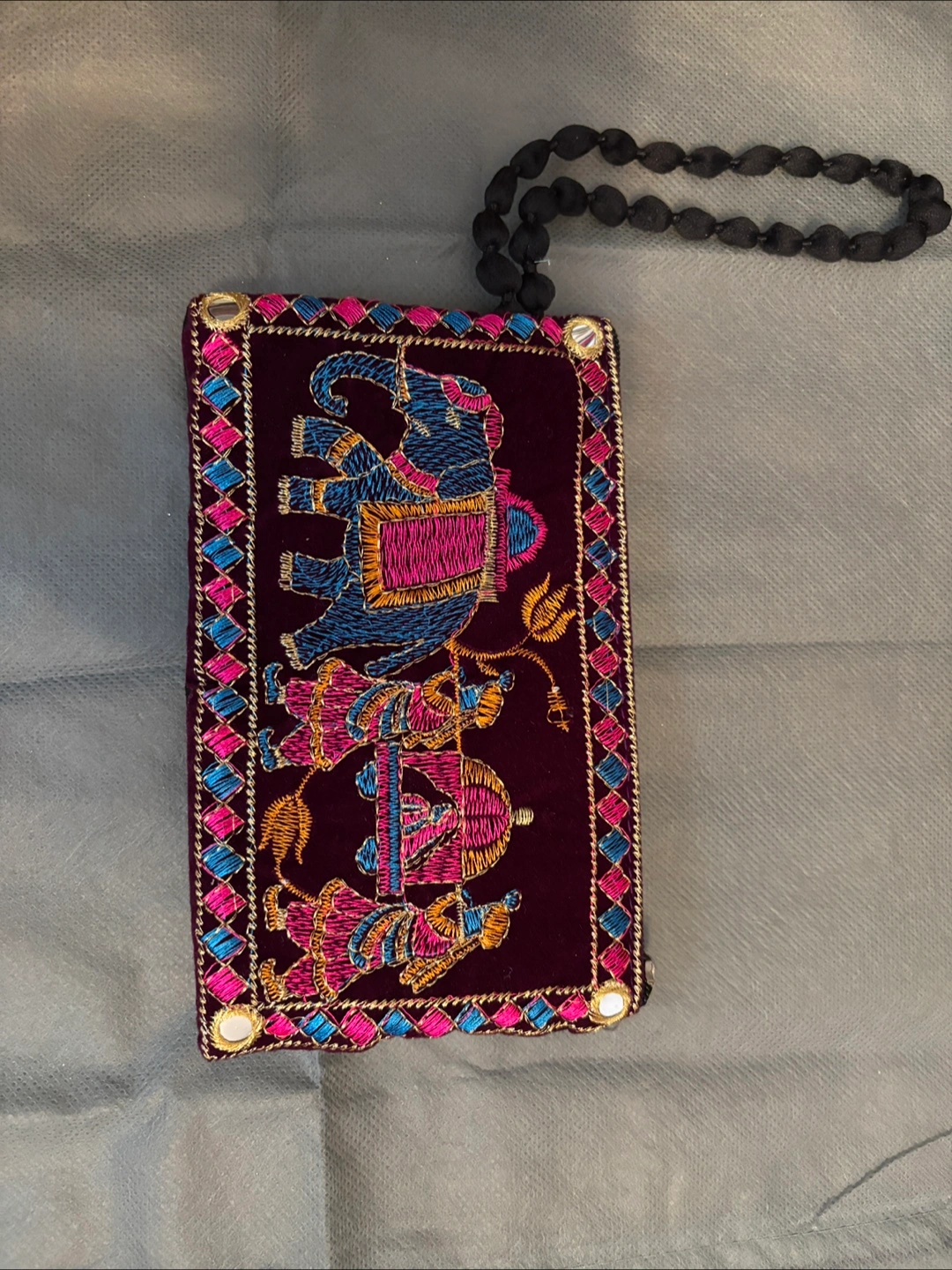 Rectangular purse. Features colourful embroidery. Has a soft bead like handle. Would make a beautiful gift for a loved one, or even yourself.