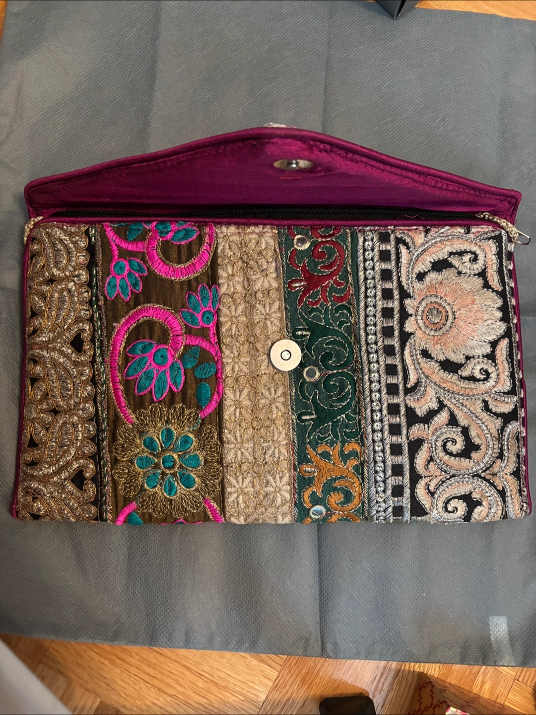 Clutch with vibrant, intricate embroidery. Features a folding flap and a zipper closure. The interior is a solid purple color. This clutch is the perfect accessory for a night out at a wedding or special occasion