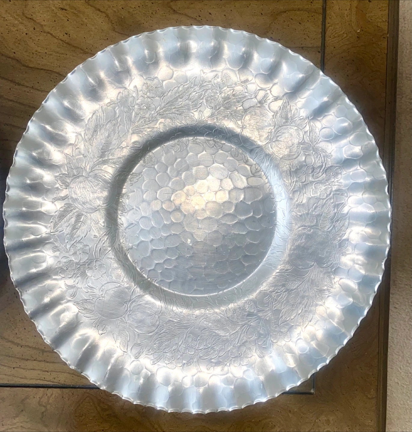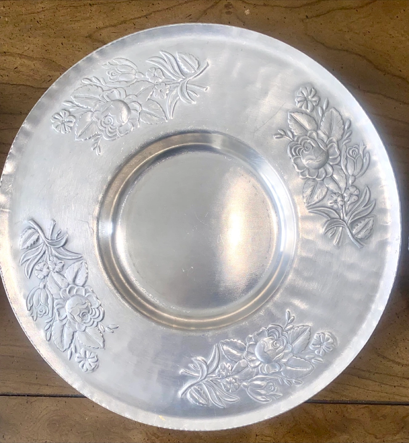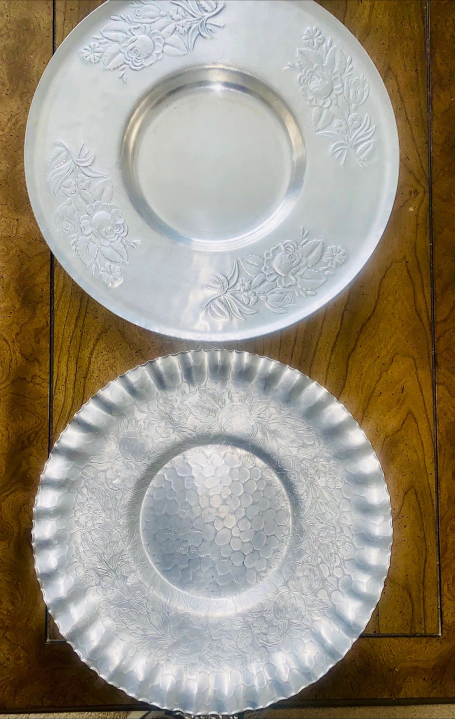 Silver-toned metal plates. Featuring intricate floral patterns. One plate has a scalloped edge. These plates would make a lovely addition to any table setting, providing a warm and inviting space. 2 big flat plates for serving 1 bucket for ice for champagne ๐ฅ 1 small boat ๐ถ shaped tray for seafood 1 big tray with handles for glasses Price is for all together