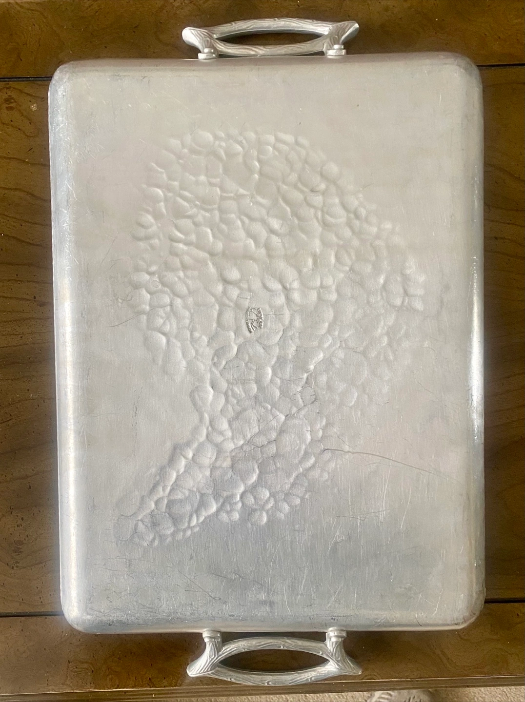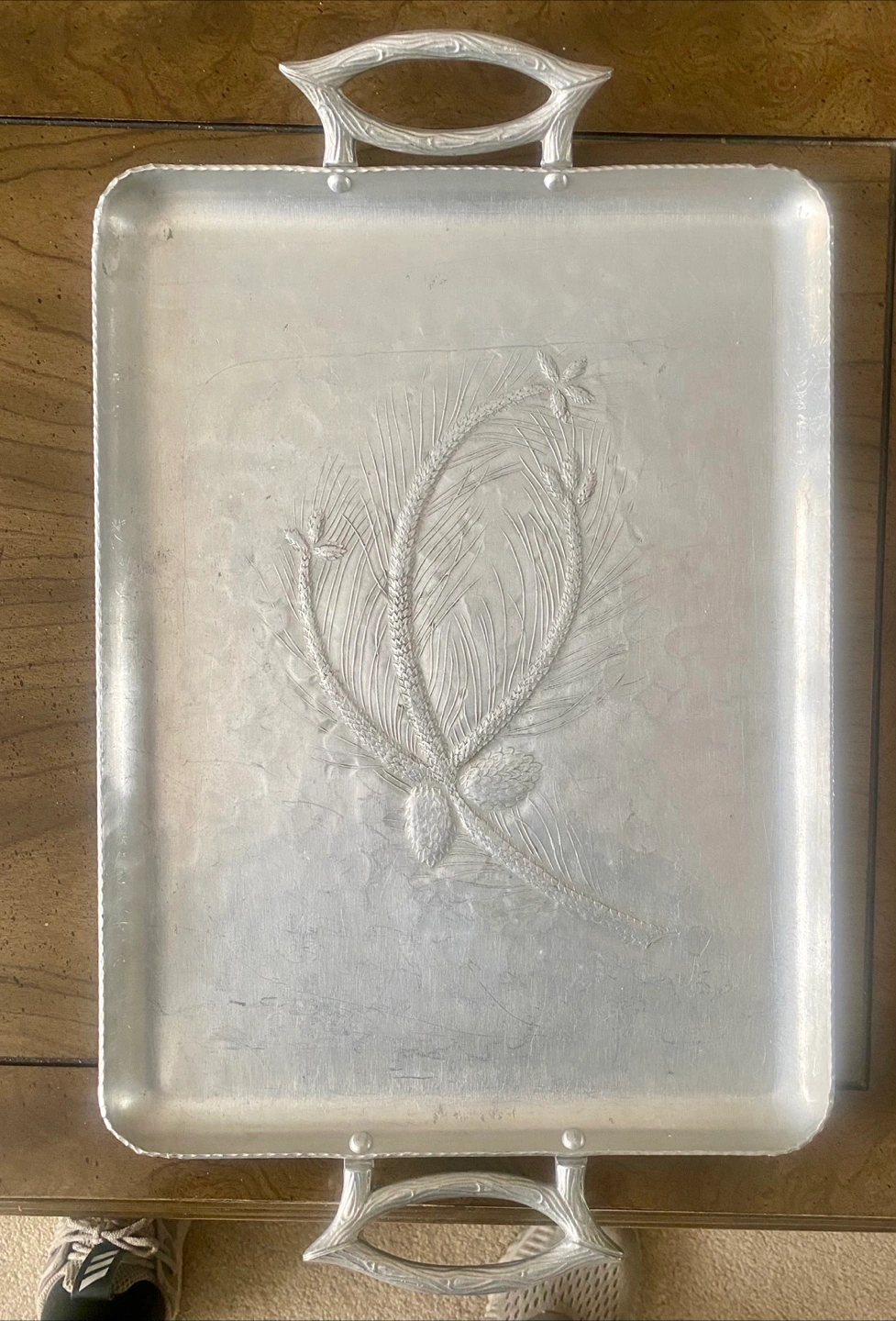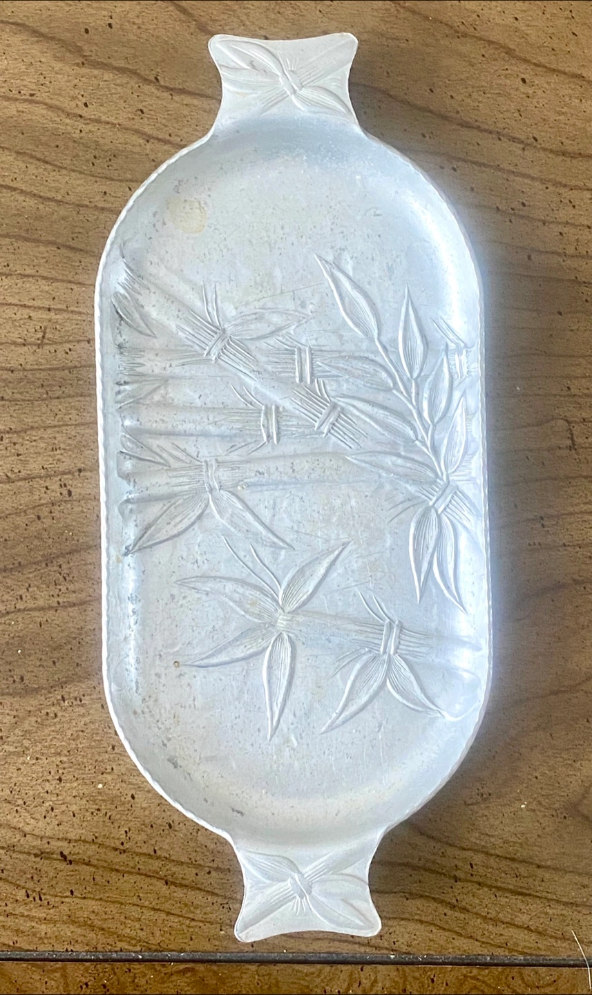 Silver-toned metal plates. Featuring intricate floral patterns. One plate has a scalloped edge. These plates would make a lovely addition to any table setting, providing a warm and inviting space. 2 big flat plates for serving 1 bucket for ice for champagne ๐ฅ 1 small boat ๐ถ shaped tray for seafood 1 big tray with handles for glasses Price is for all together