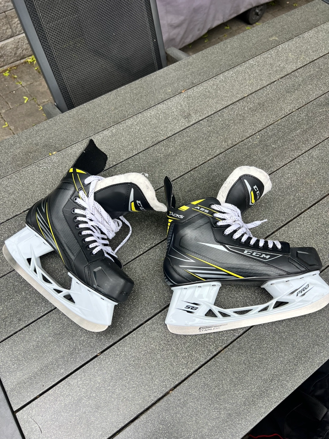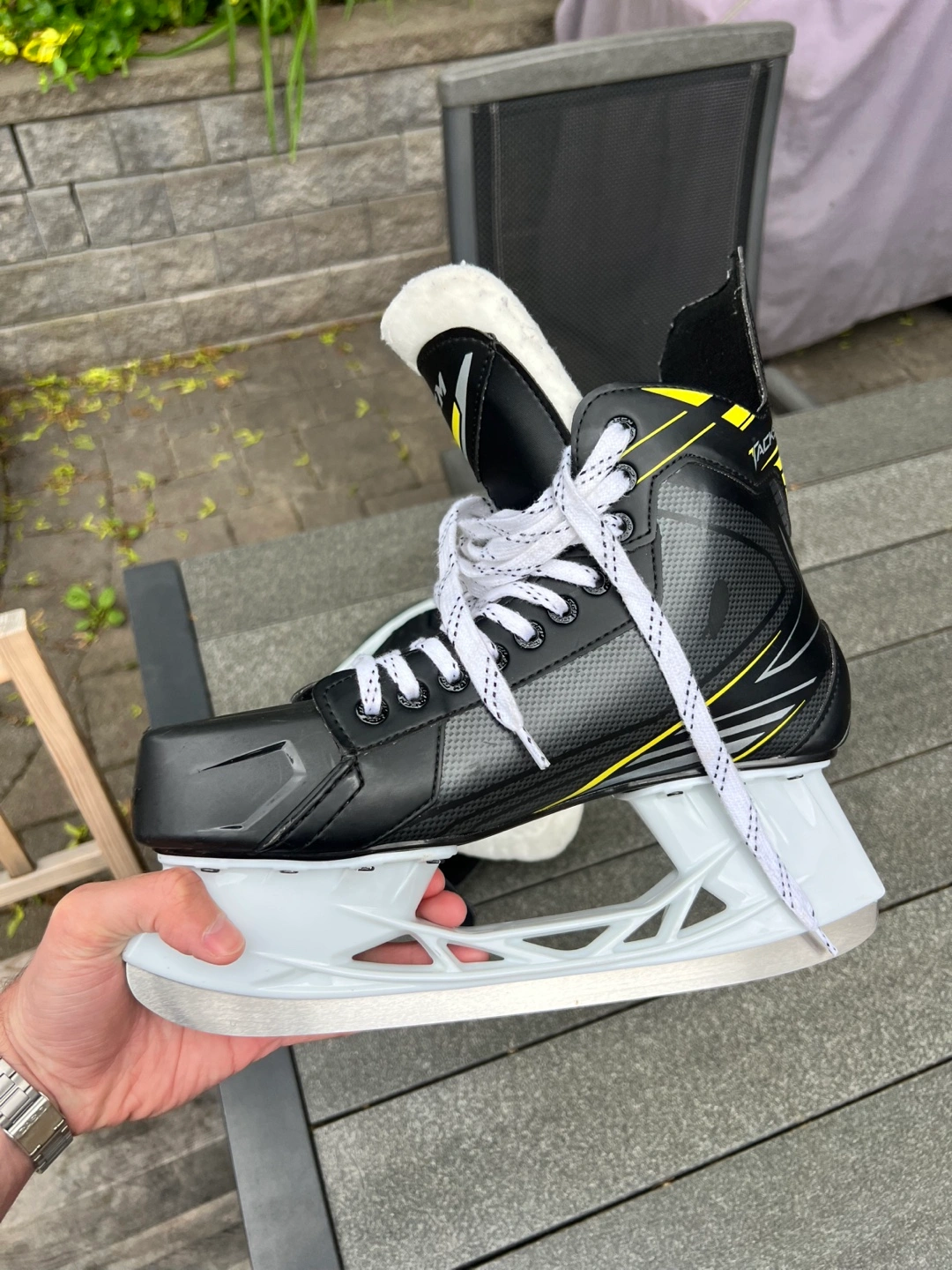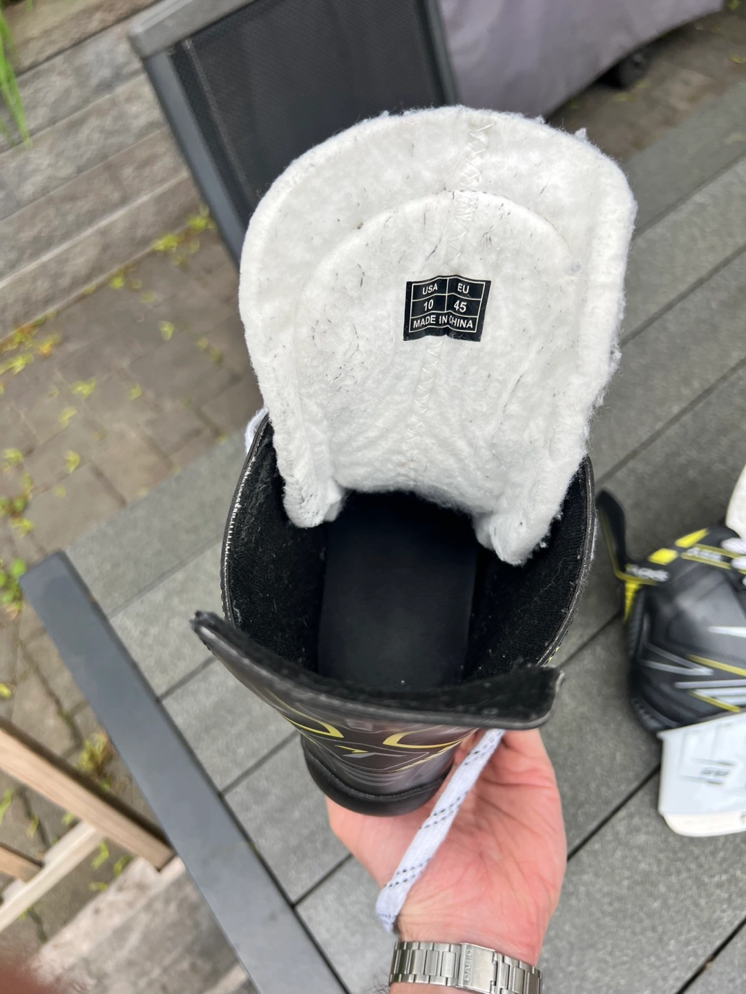 Ice skates in black, white and yellow colours. The skates have white laces. Interior of the skates have a white lining. Size 10m Barely used and recently sharpened