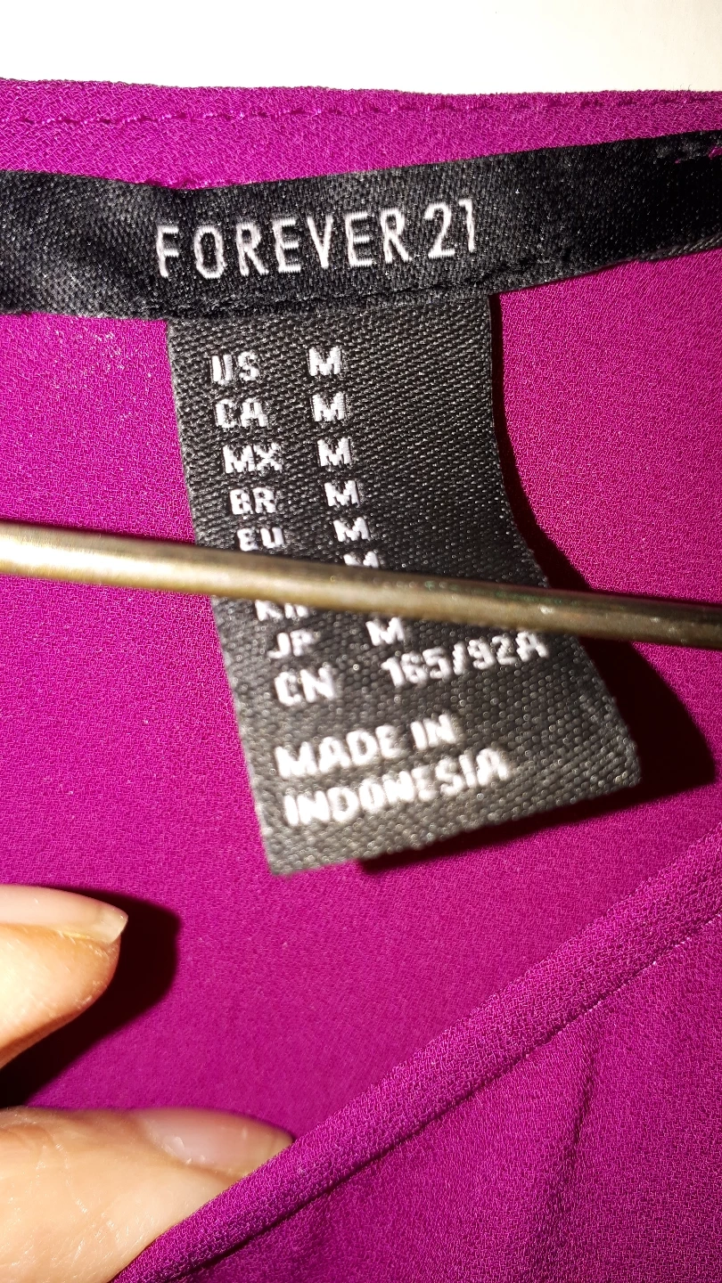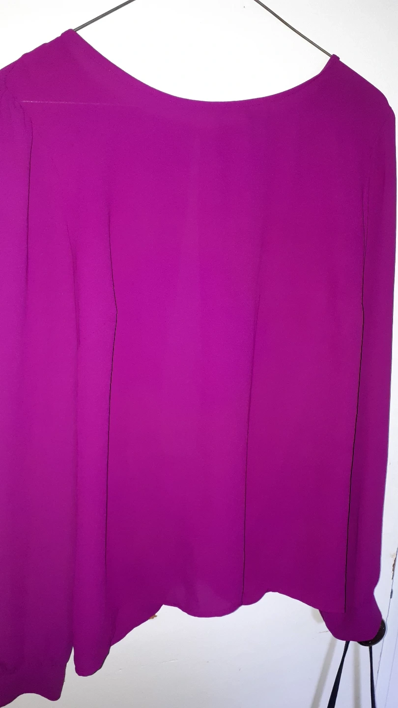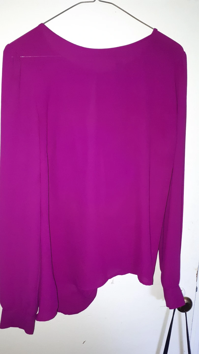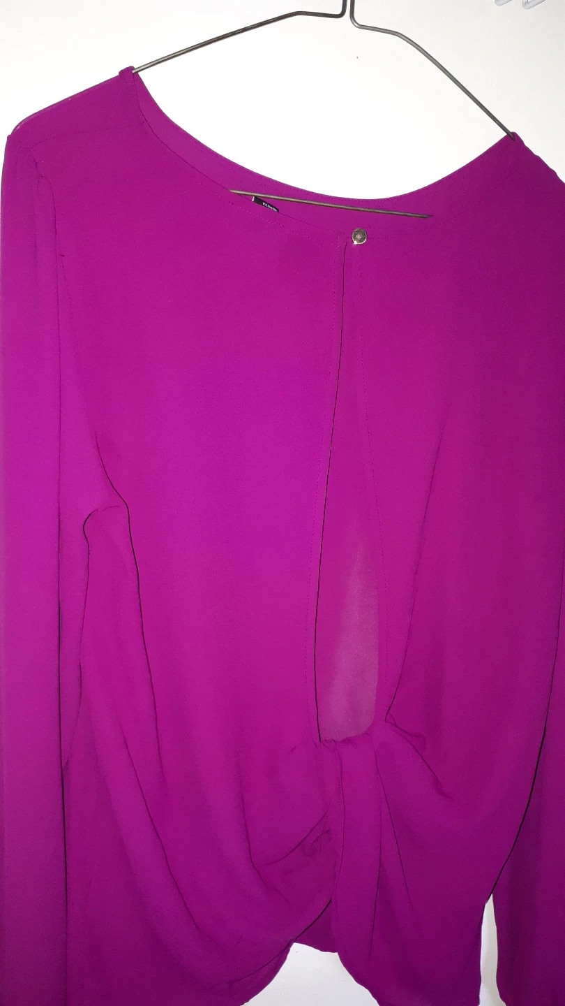 Magenta coloured blouse. Long sleeves with button details. Has a rounded neckline. The back has a knot design. This blouse would look lovely for any occasion, whether it is a casual or dressy event.