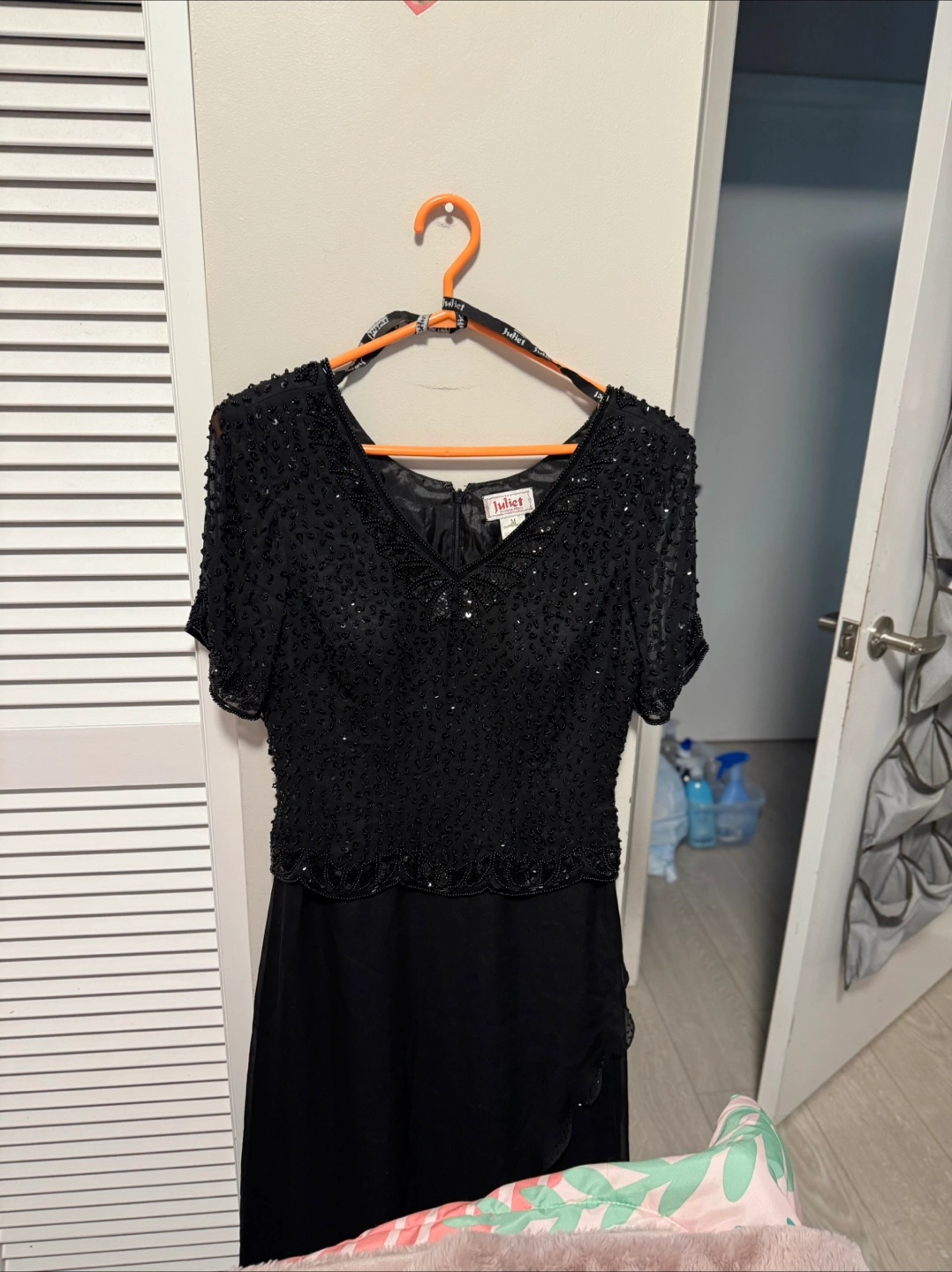 Black dress with short sleeves. Heavily beaded bodice, flowing skirt. Perfect for a night out, you'll love how the dress feels against your skin.