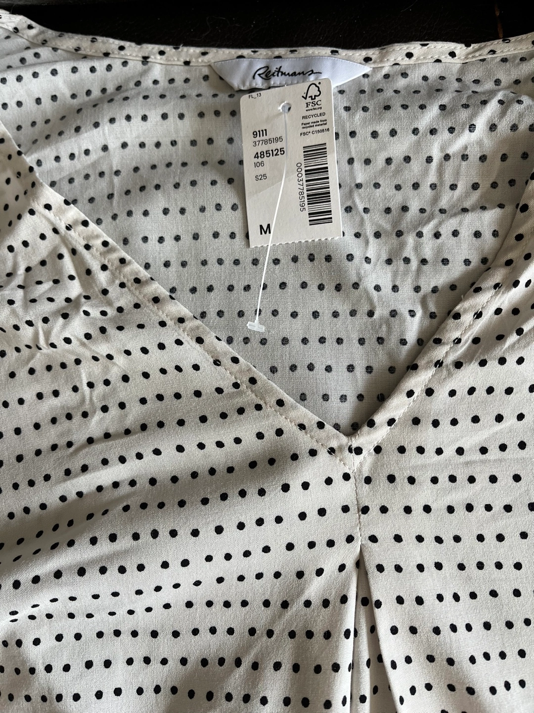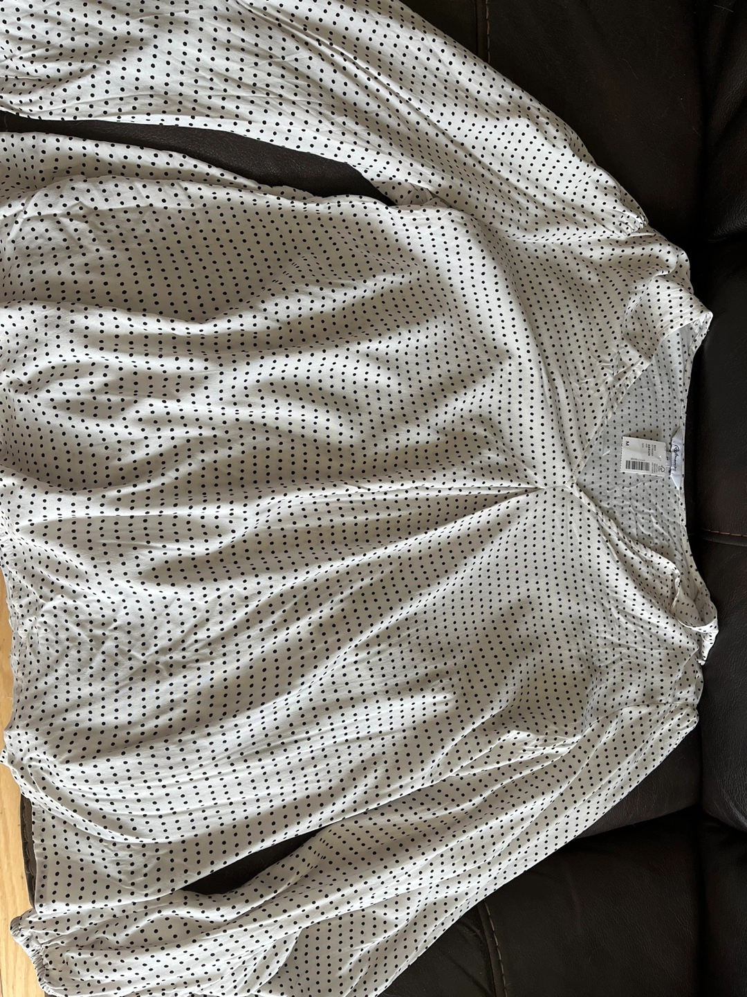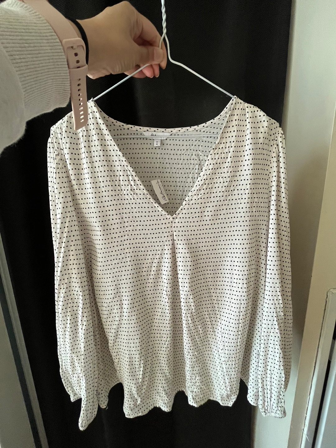 White blouse with black polka dots. V-neckline with long sleeves. Relaxing in this top will become one of your favourite activities.