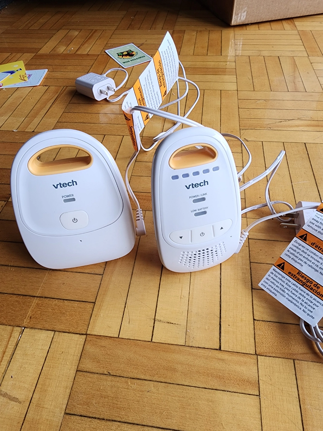 Set of two baby monitors. White and yellow accents. Includes power cables and information tag. Use this item to watch over your little one with peace of mind.