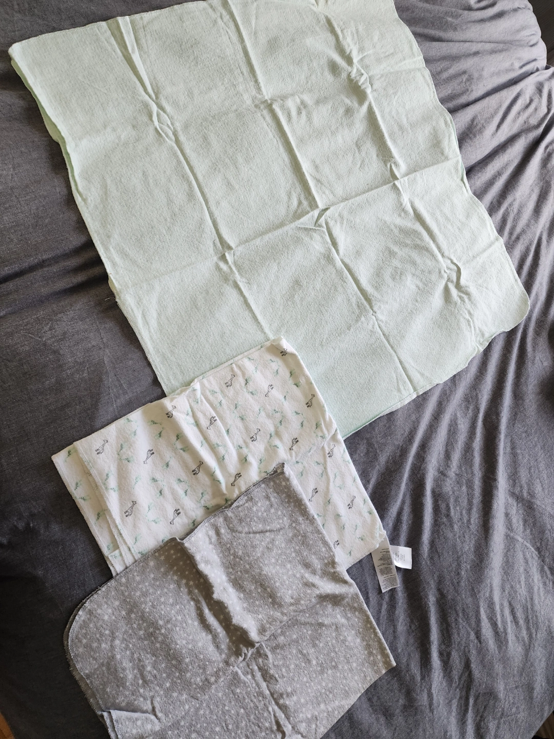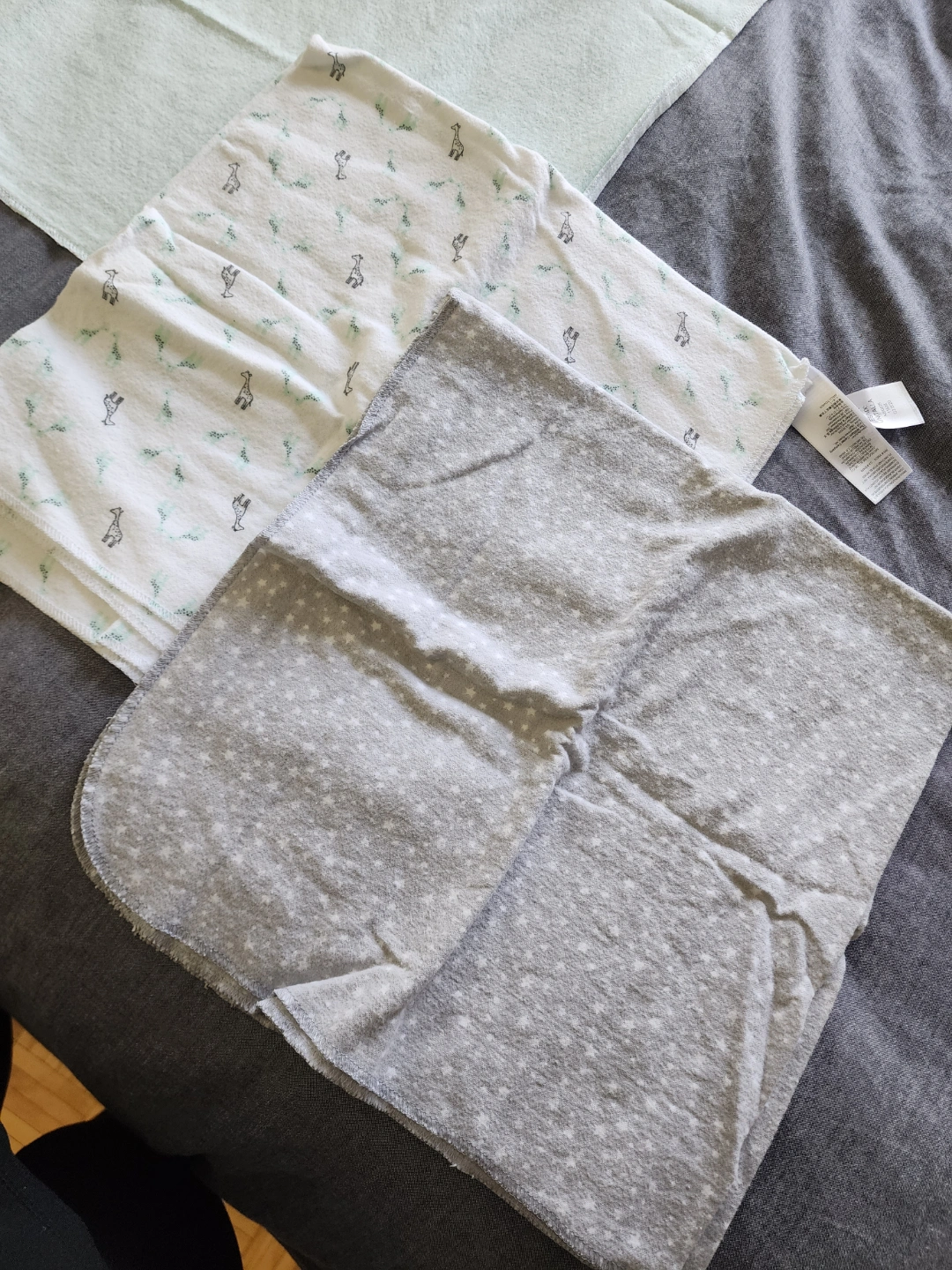 Swaddles in a soft material. One in a pastel green. One with a giraffe pattern. Another in a grey star pattern. never used.