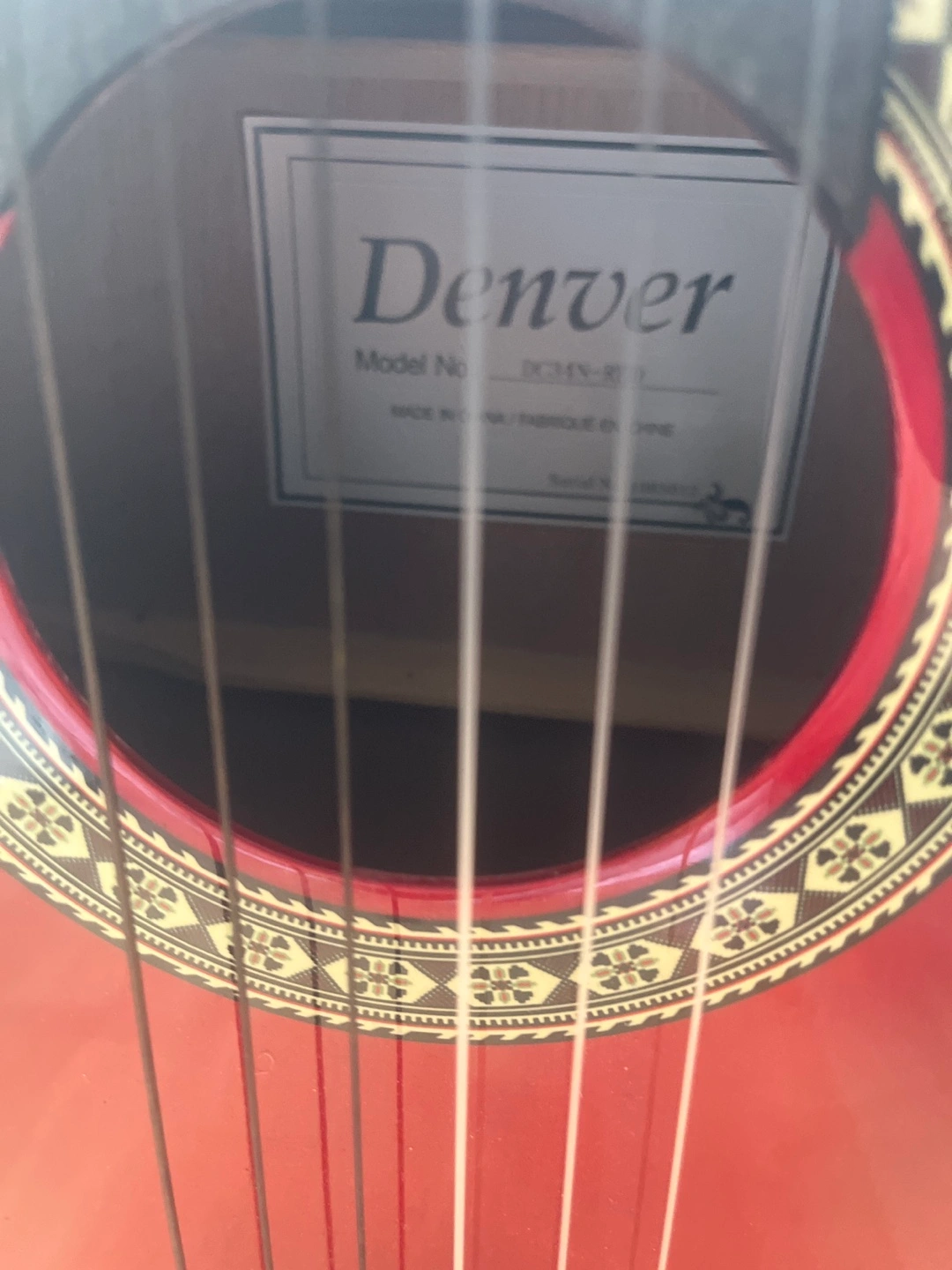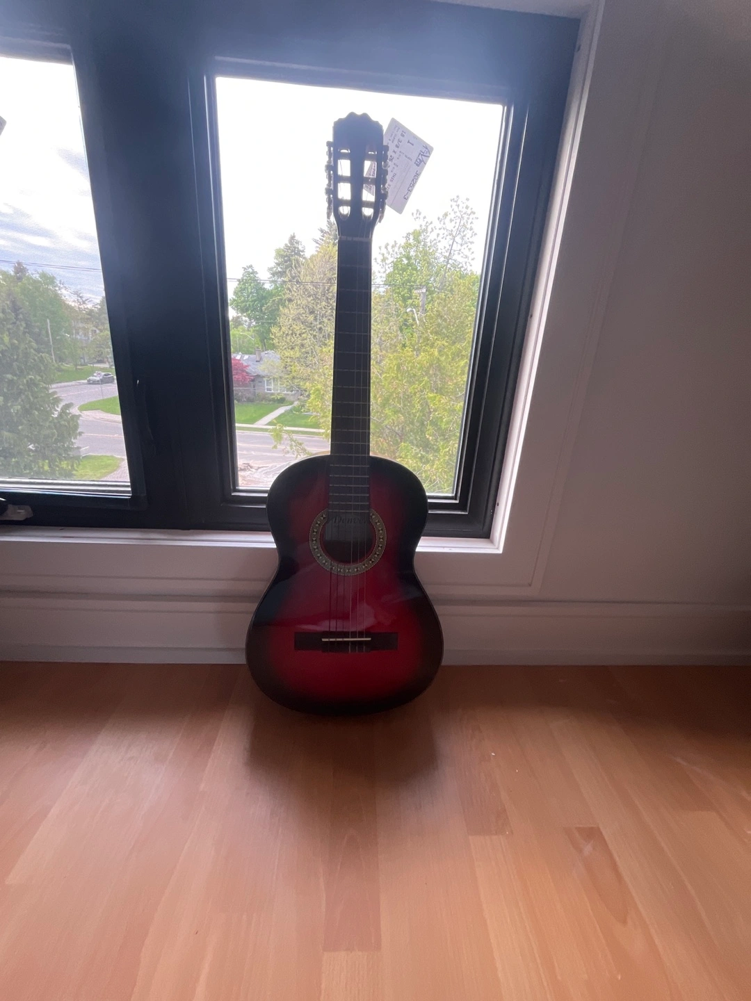 Classical style guitar. Red and black colouring. Body shape is visible. Would be a wonderful companion while taking some time for yourself.