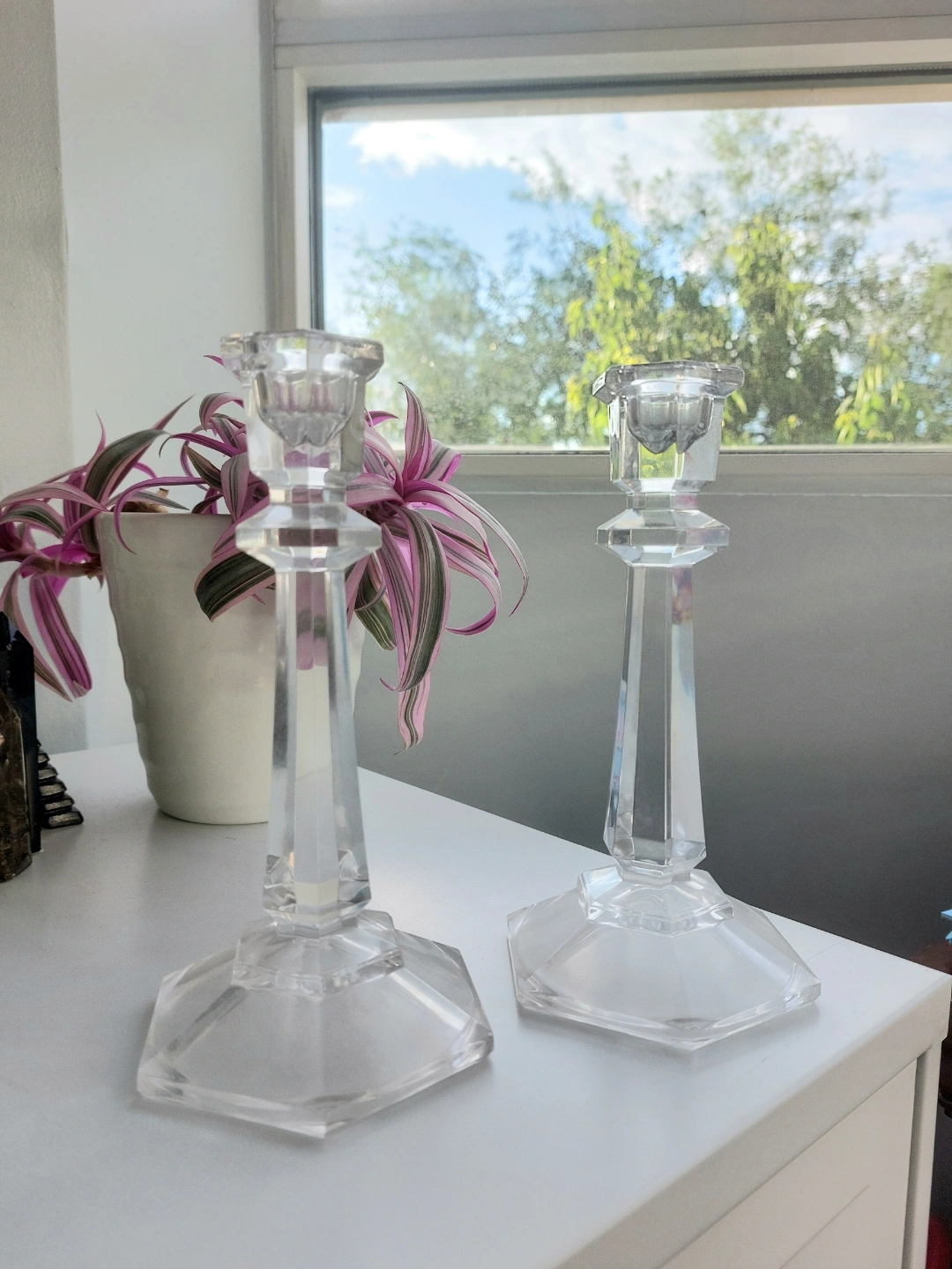 Pair of clear glass candlesticks. Octagonal bases. Faceted bodies. Available late morning to early afternoon on the weekends, and occasionally during the week. Pickup only unless bundled with another item.