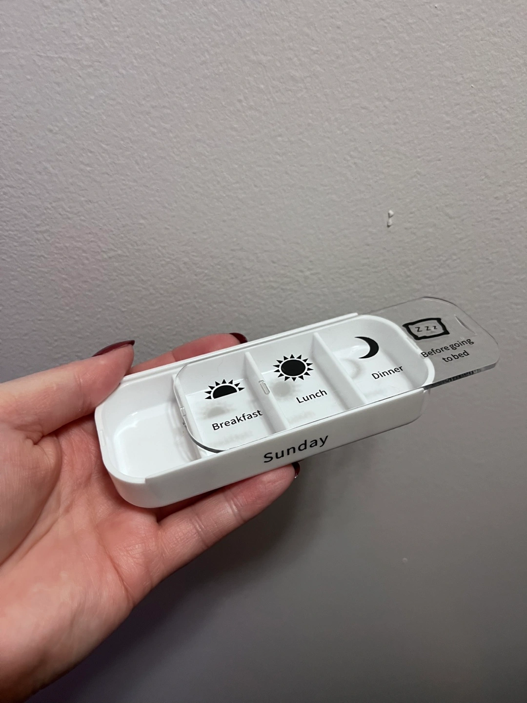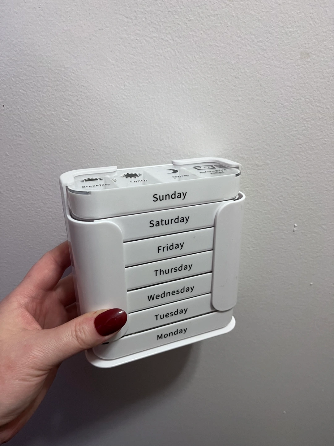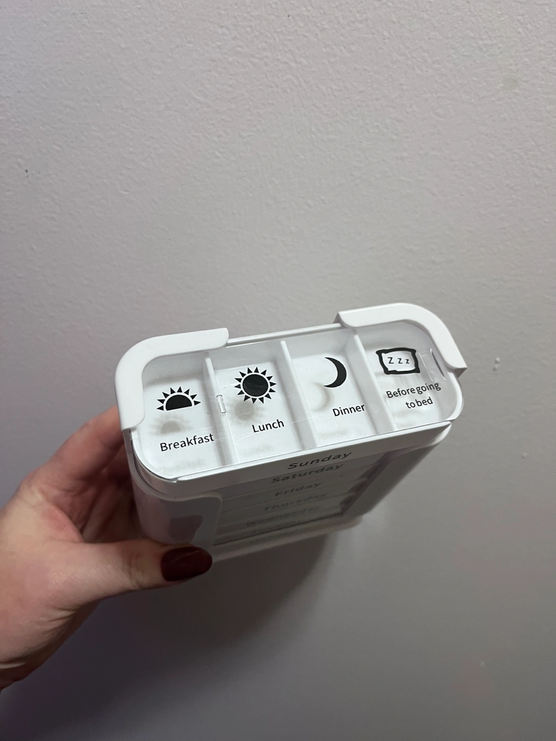 White weekly pill organizer divided into days of the week, with four compartments for each day labeled: Breakfast, Lunch, Dinner, and Before going to bed. Great to help organize your medications and keep track of your daily doses. LOCATION: for pickup at my apartment building entrance in Parkdale near King St W and Jameson Ave
