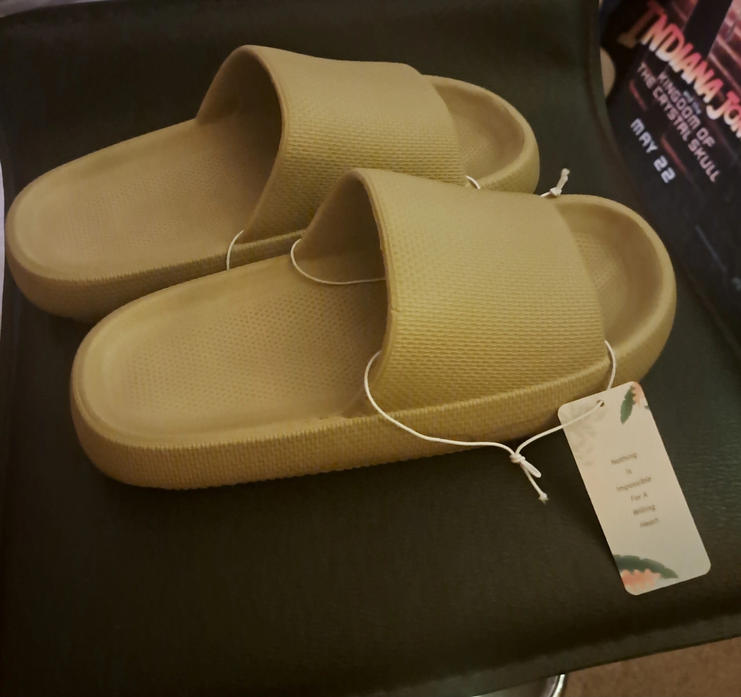Pair of slides in a neutral tone. Slides have a textured upper. A great way to give your feet a rest after a long day.