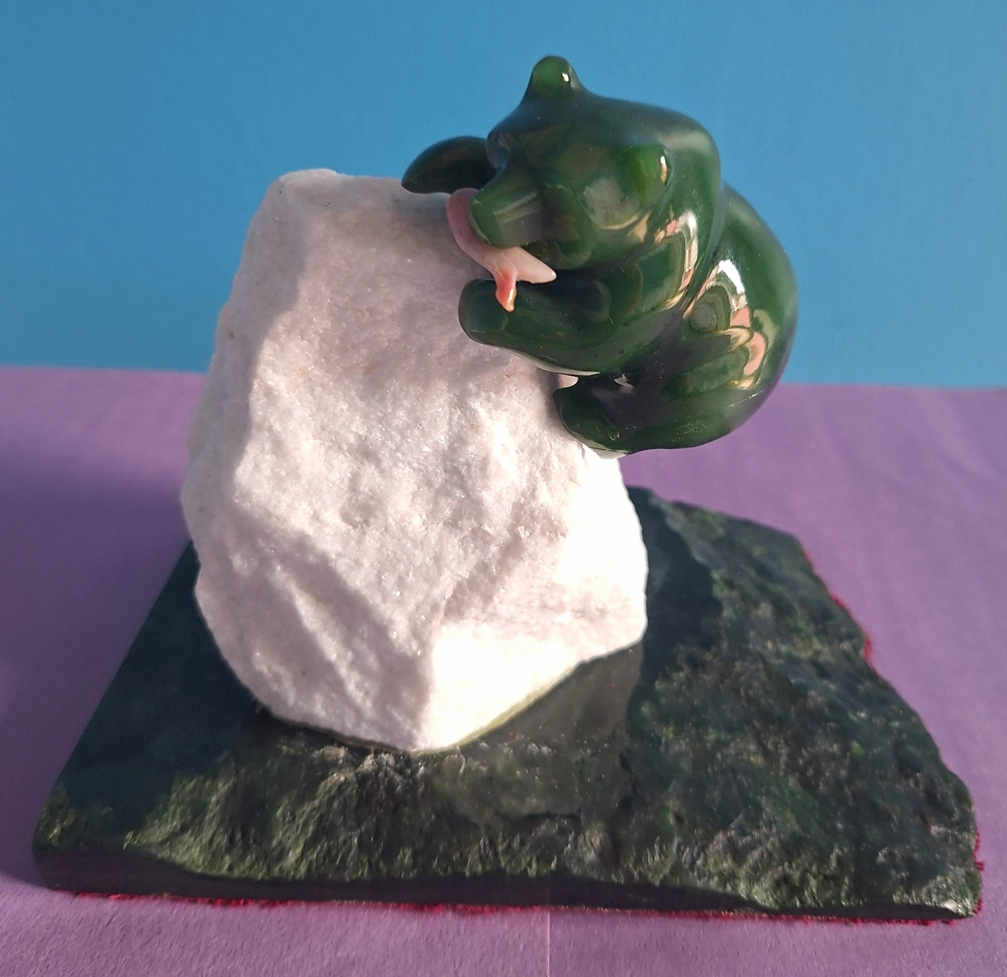 Features a green jade bear statue with salmon in a mouth. The bear appears to be climbing up an iceberg (marble) that mounted on a jade slab. 7x4.5 inch, 6 inch tall, bear itself about 3x1.5 inch. Unique Canadian carved art.