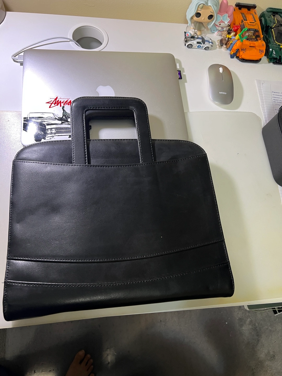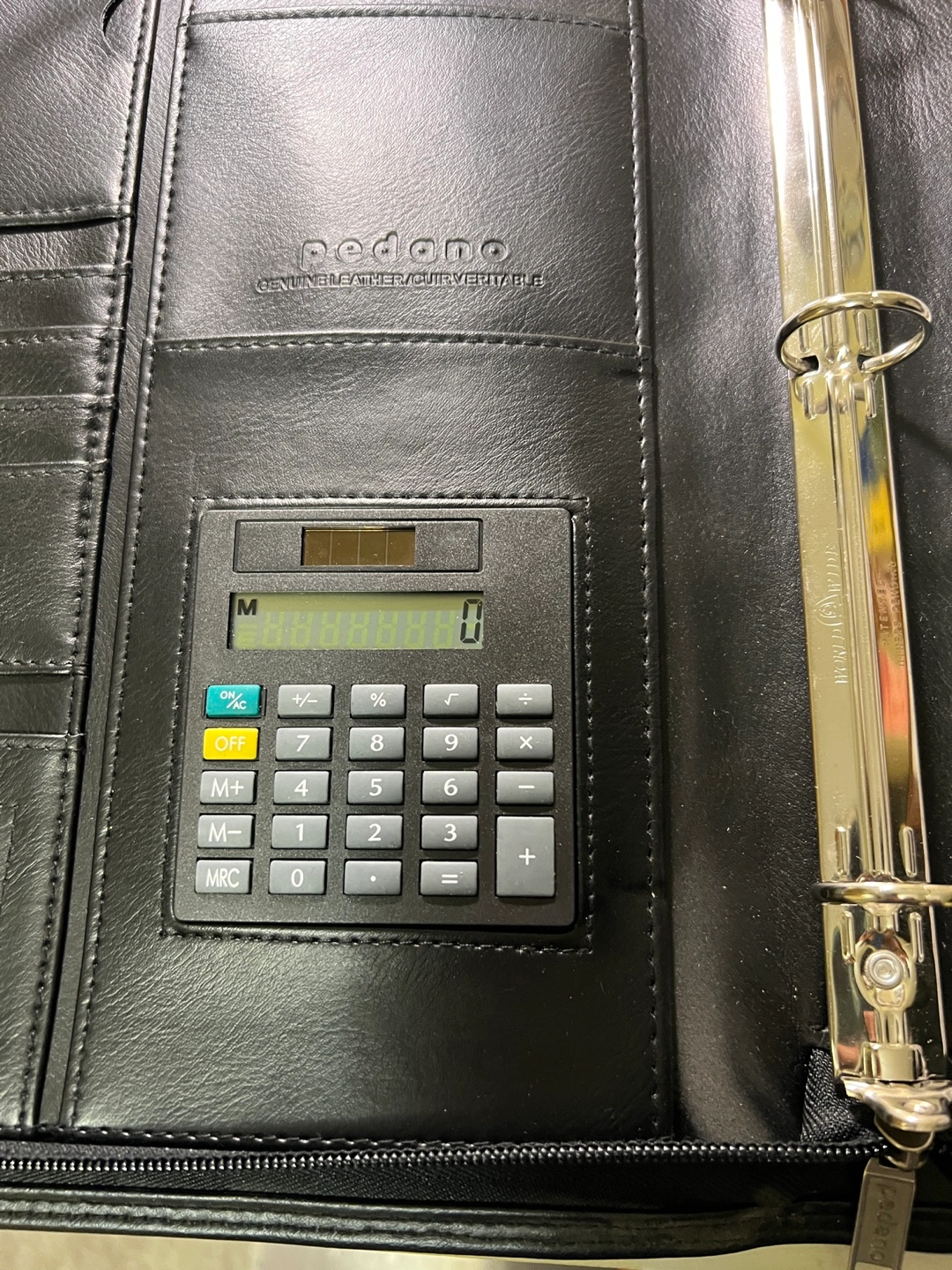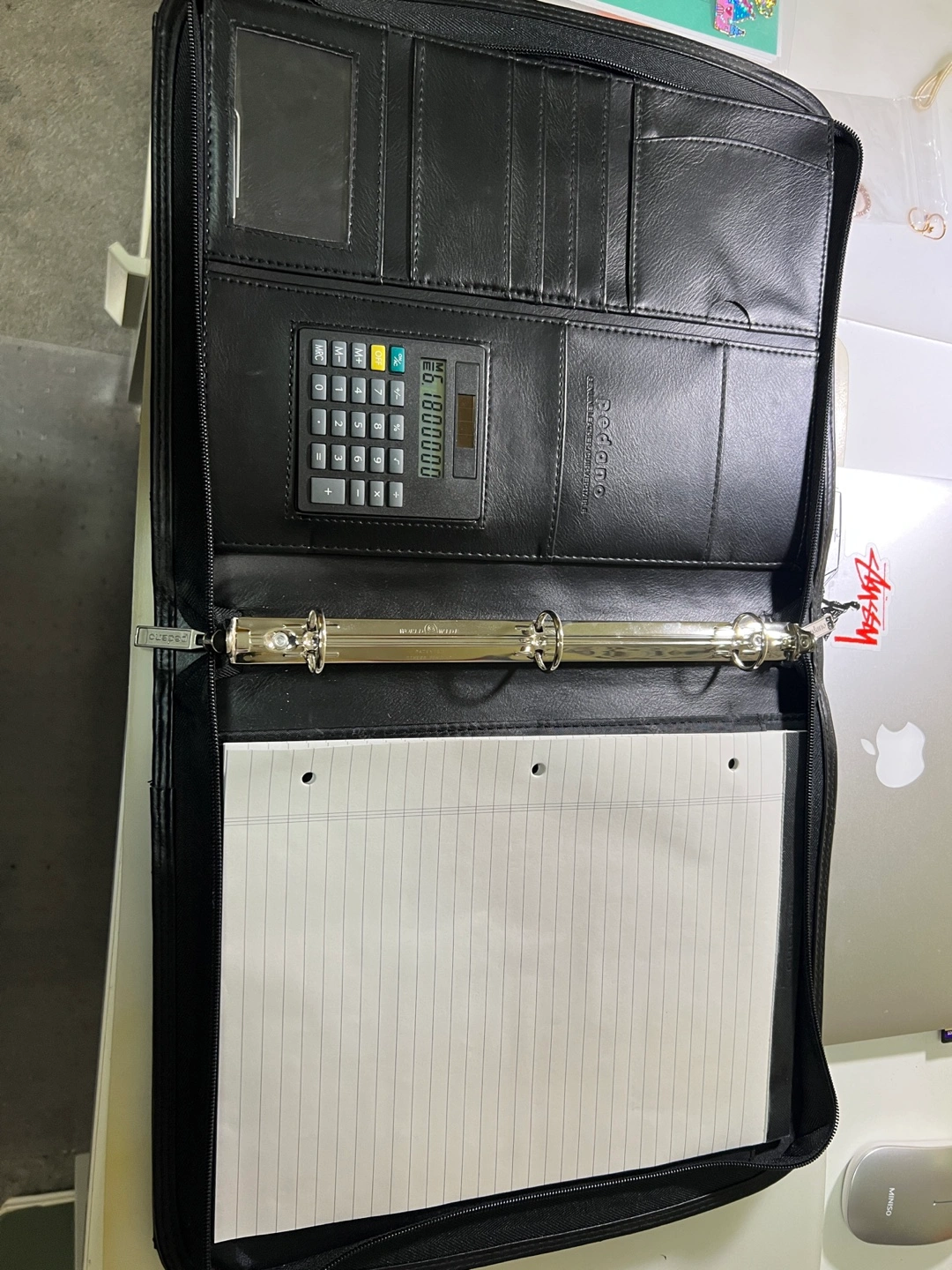 Black genuine leather portfolio with a handle. Includes a zipper. Could be used as a mini briefcase or as a portfolio.Interior features a calculator and binder rings. Consider using this to organize your paperwork to help you be more productive. Cash only