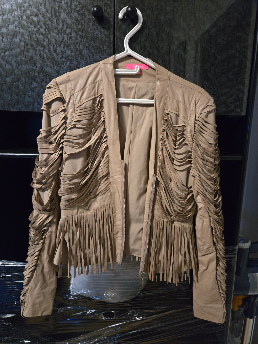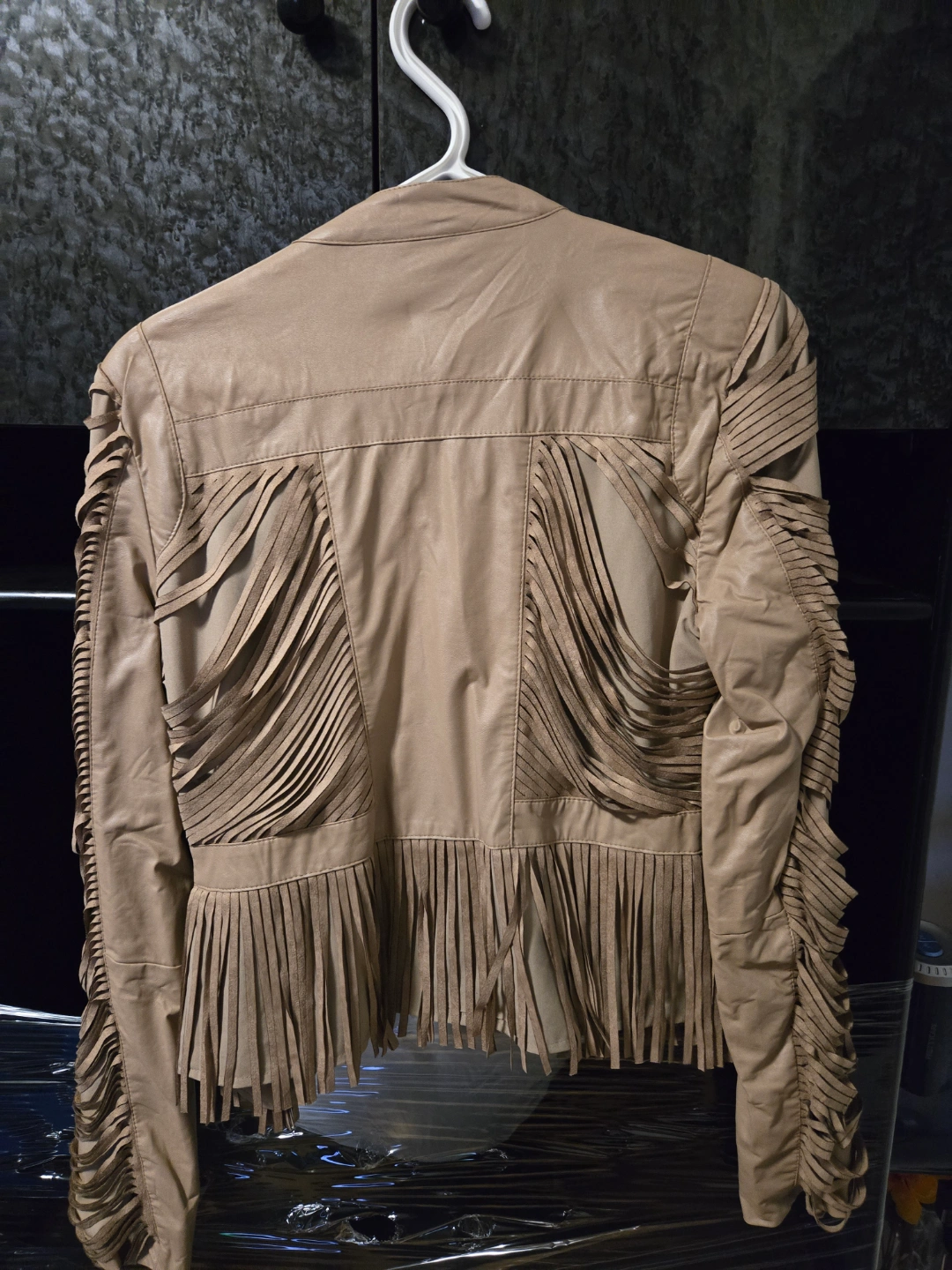 Beige jacket. Includes fringe detailing across the back, sleeves, and front. Zips up the front. Can be worn with jeans or a dress for a stylish look. pick in north york Victoria and rowena dr