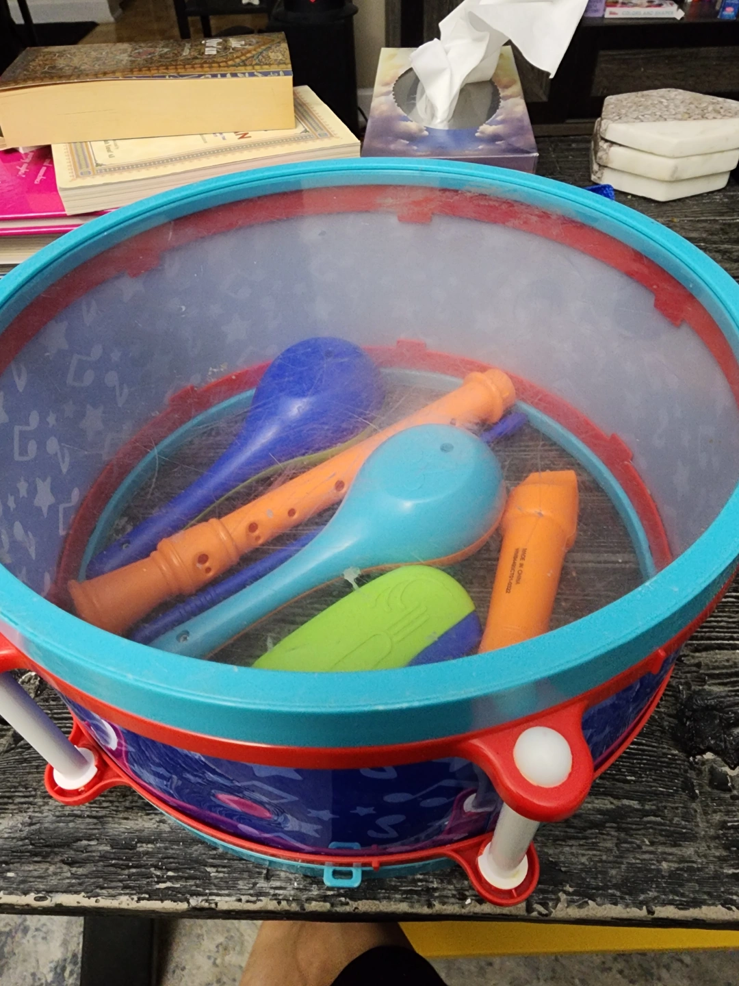 A colourful drum container. Inside musical instruments in a variety of colours. Perfect for entertaining your children or for some light therapy through sound.