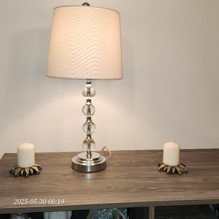 Table lamp with a fabric shade. Features a chrome base and a clear crystal ball design. Could bring a nice ambiance to any room. sale it because of the downsizing North York Center