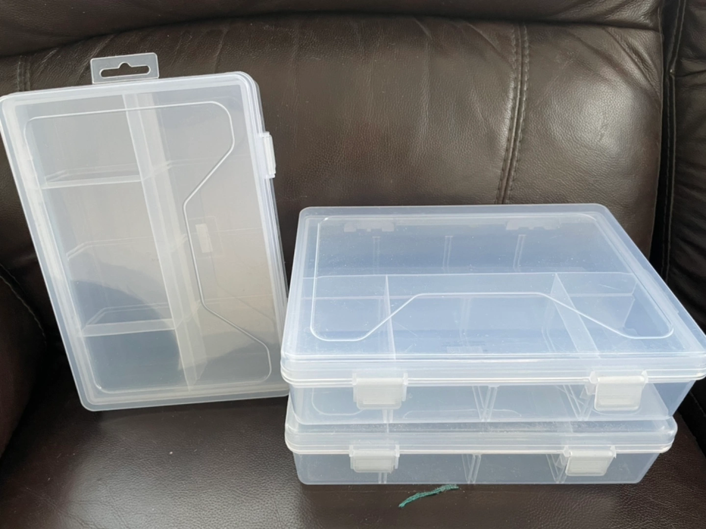 Excellent condition. No chips or cracks. Clear plastic storage boxes. Several compartments inside. Great for organizing small items. These boxes can help you stay organized and find things easily.