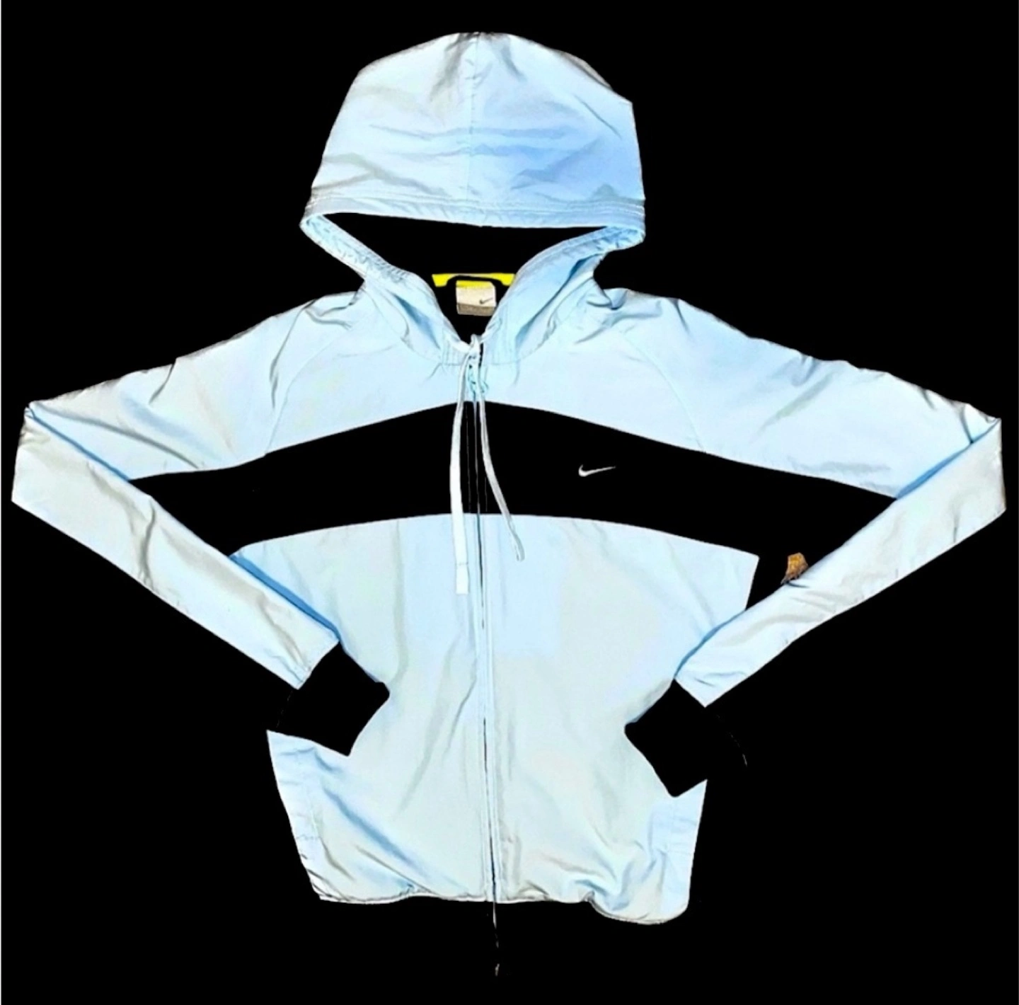 Hardly worn, absolute mint condition, from the early 2000s. Women’s size SMALL. Can also fit a smaller sized medium (will be less of a relaxed fit) Rare Has a hood (huge bonus)! And pockets. The back of it is completely black, but the hood is still baby blue.