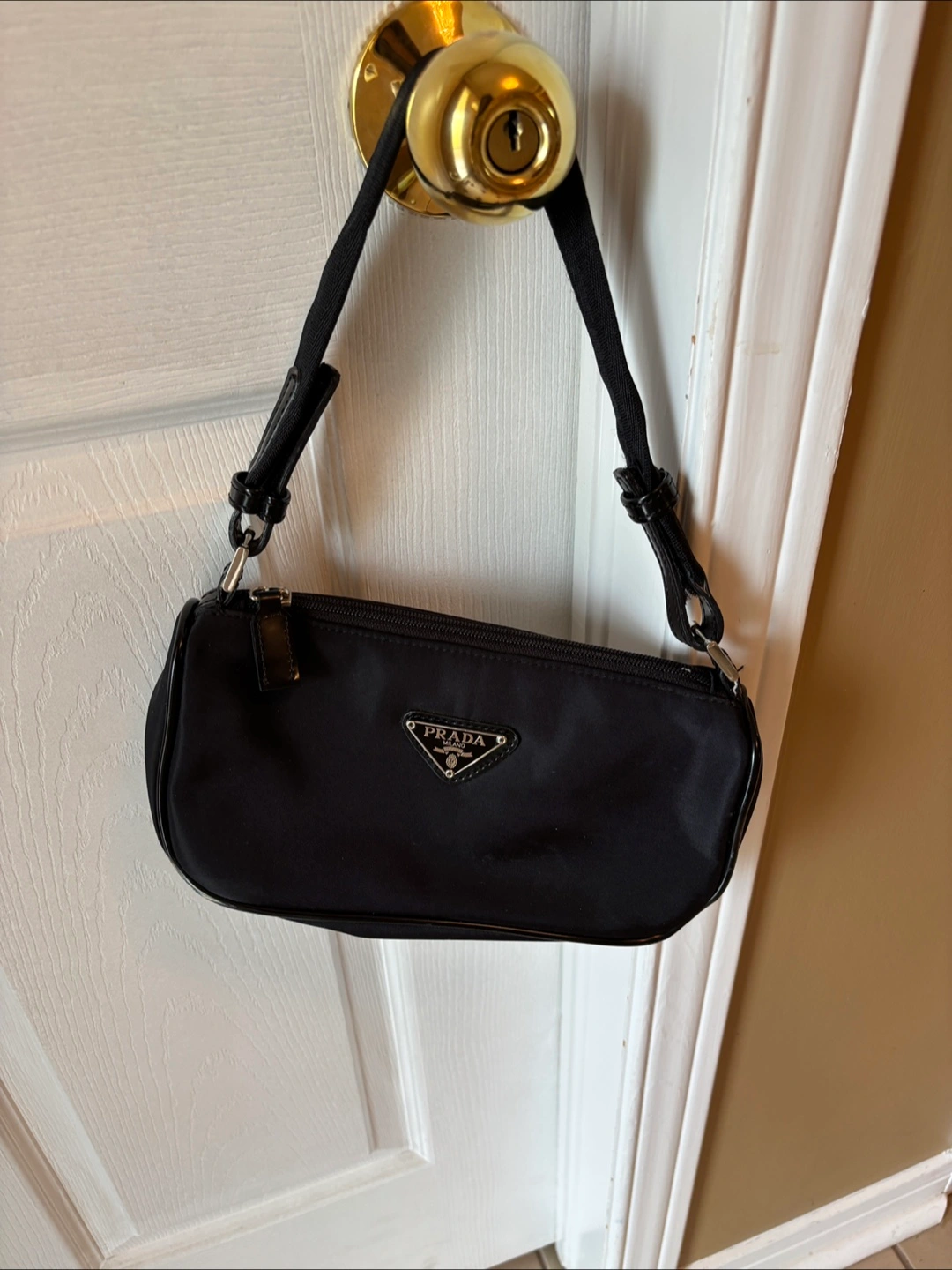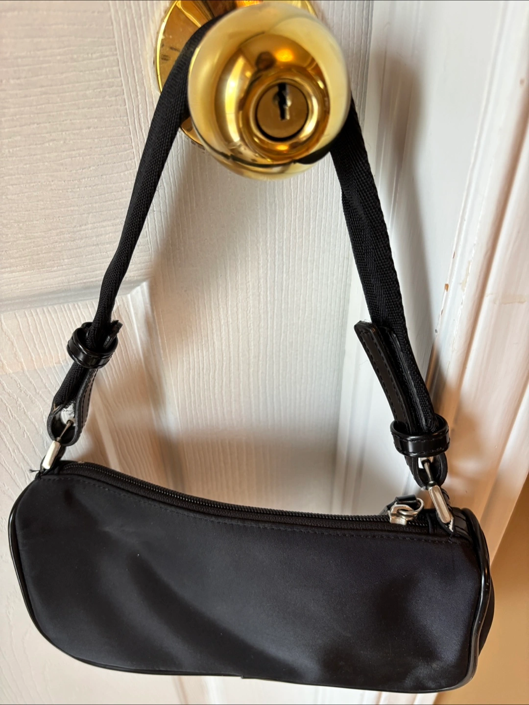 Black handbag with a zipper closure. Features an adjustable strap. Great for carrying essentials. Price reflects authenticity