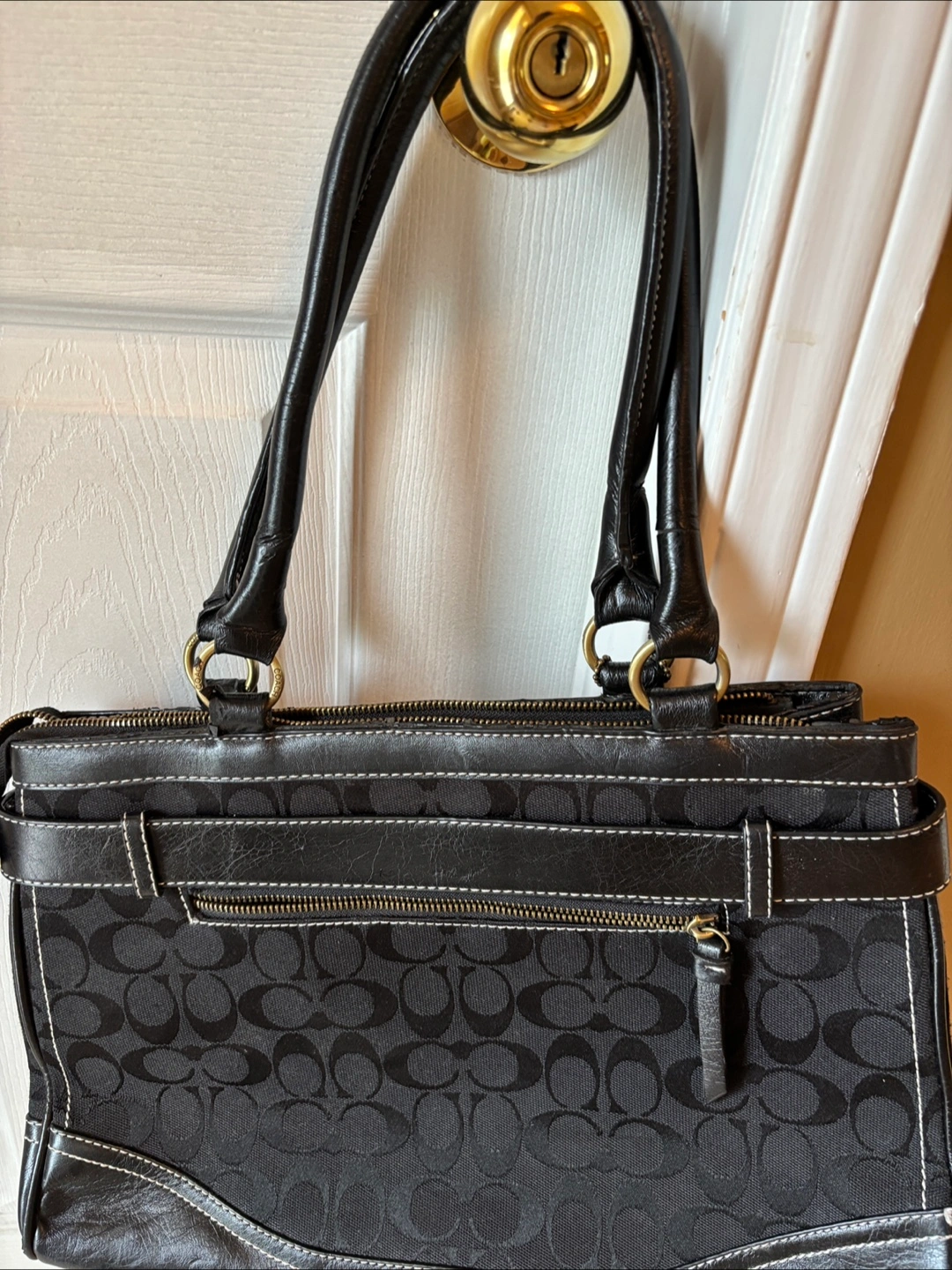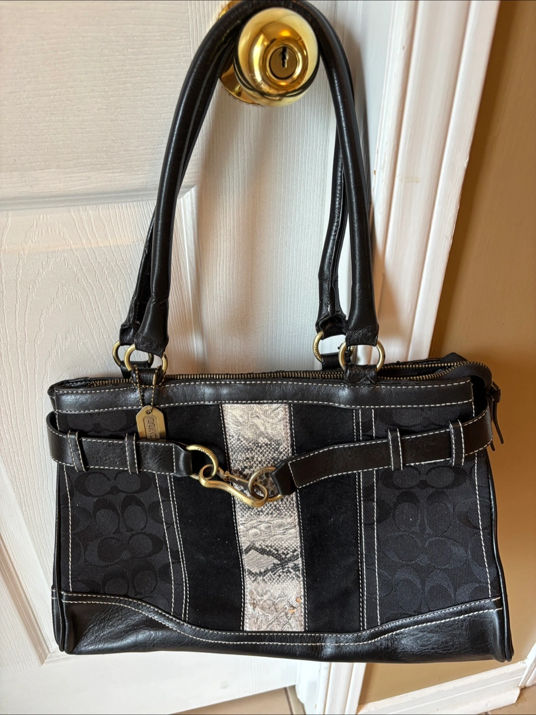Black handbag with snakeskin accent. Features black leather handles and detailing. Includes a zipper closure. The white stitching creates a nice contrast. Perfect for everyday use as it has ample storage space. Some wear.