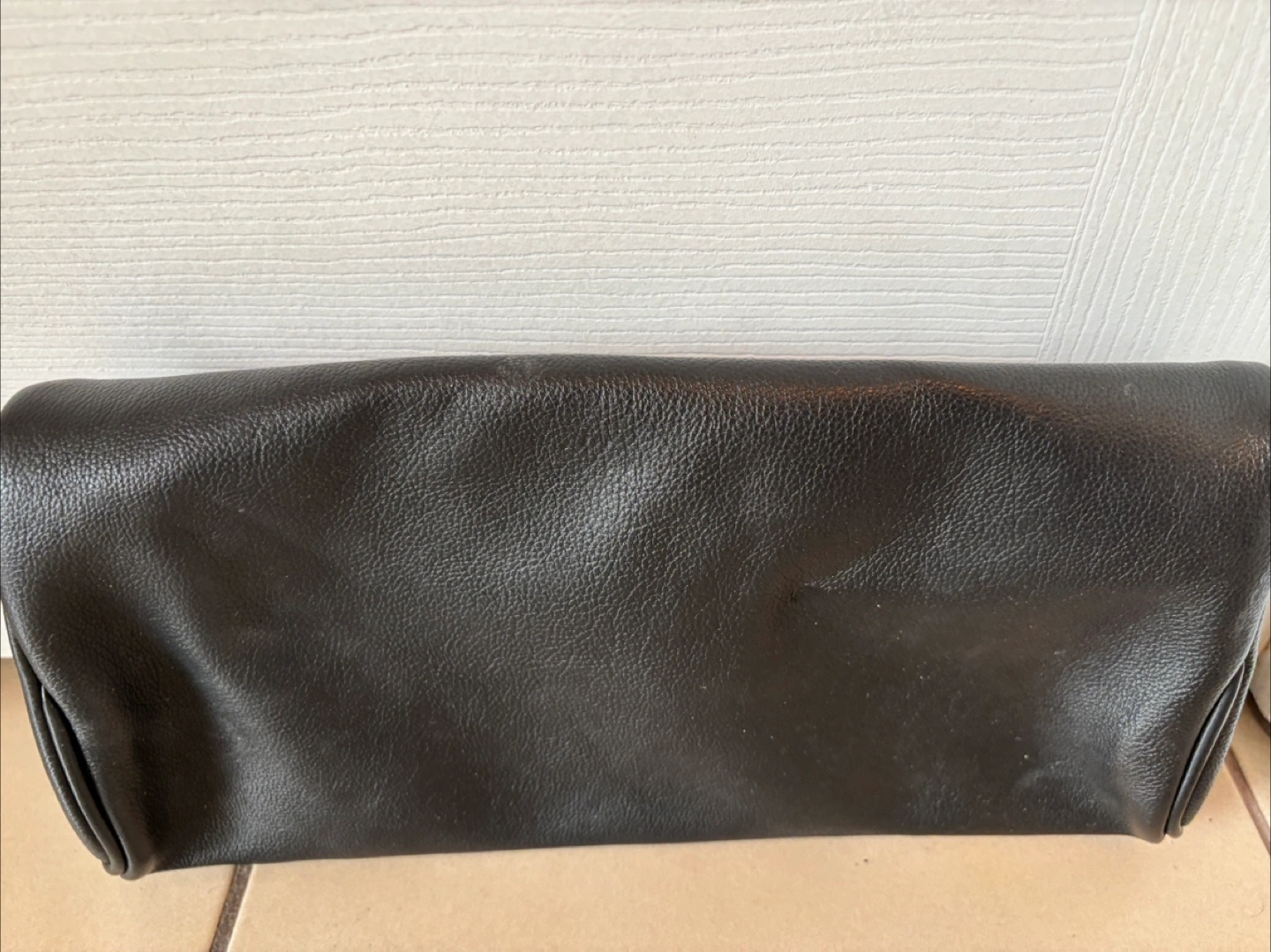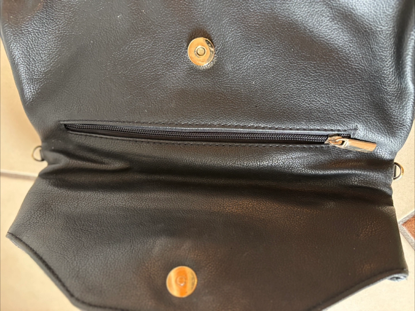 Dark colored purse. Features a flap with a gold-tone turn lock closure. The interior has a zipper pocket. The clutch is a lovely accessory for any outfit.