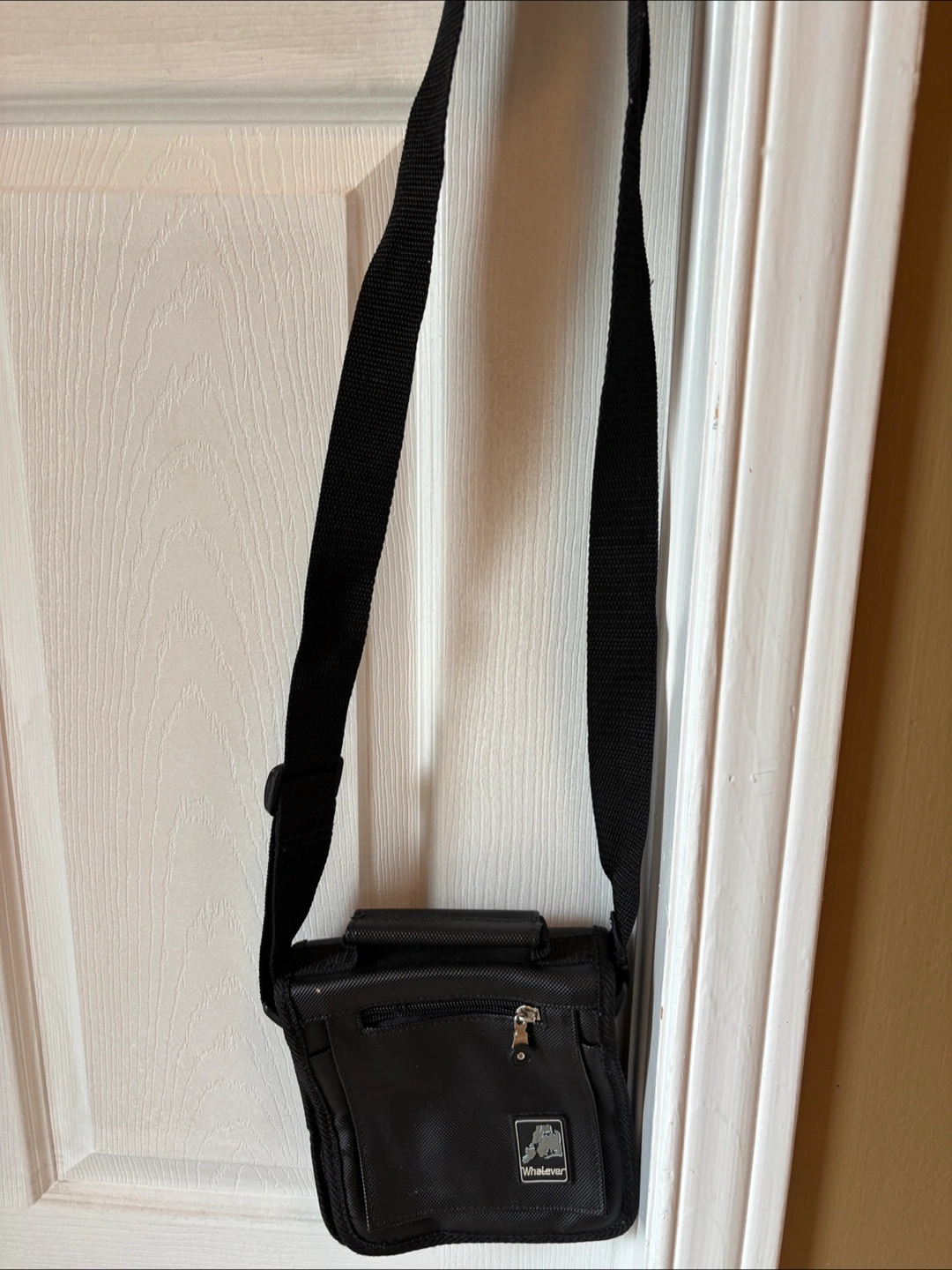 Black bag with adjustable strap. Front zippered pocket. Handle on top. The interior includes pockets. A convenient item for carrying all your essentials.