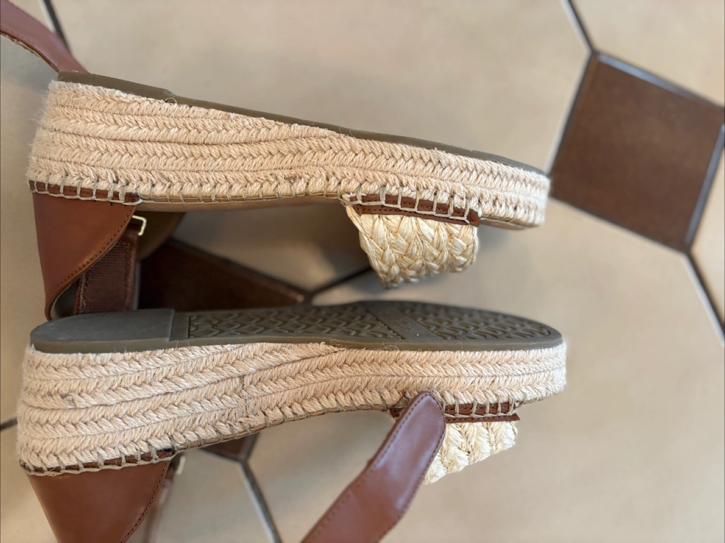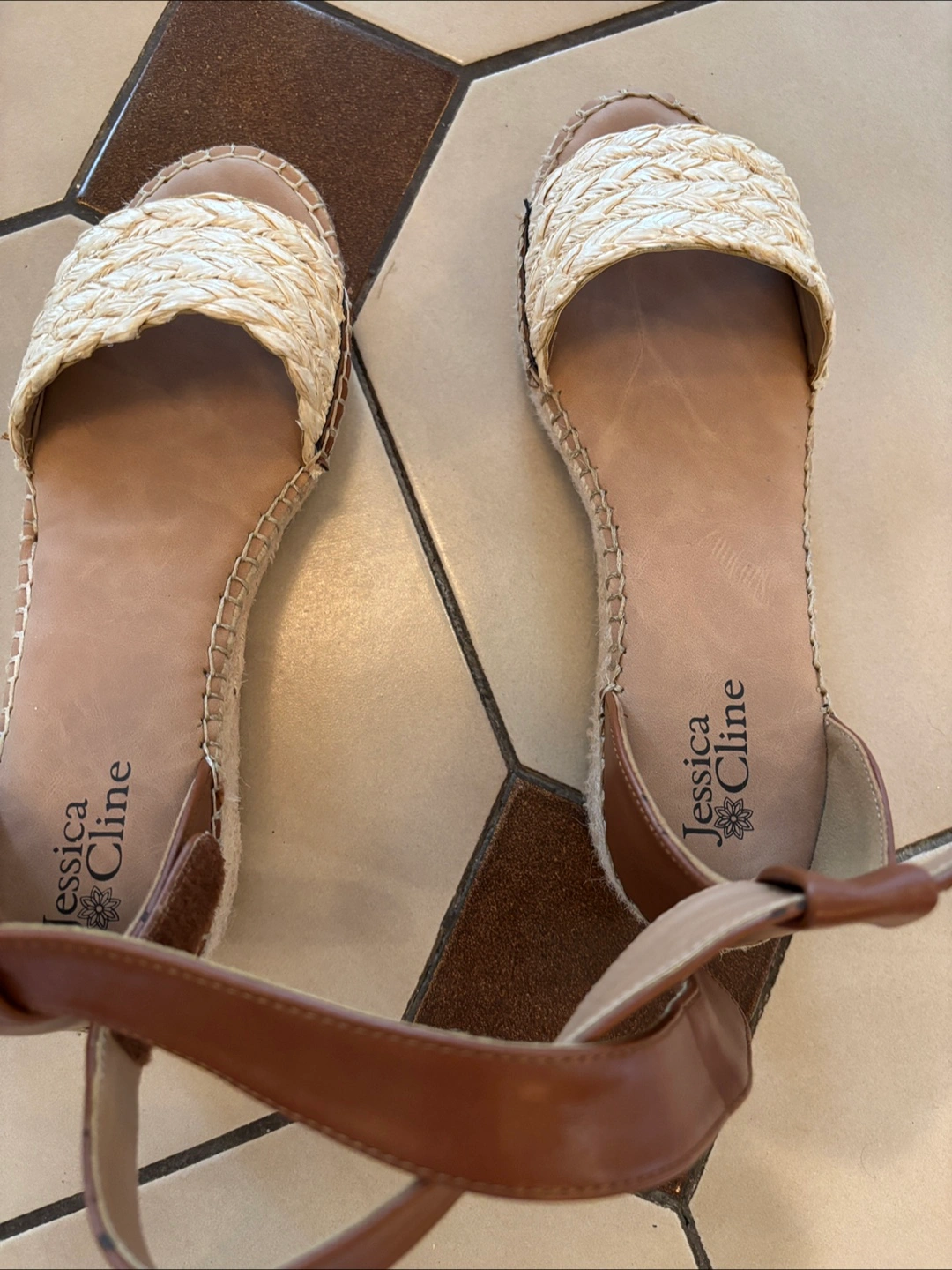 Espadrille style sandals. Feature brown leather straps. Woven platform soles. The perfect shoes for a relaxing walk on a summer evening. Low heel and woven style.