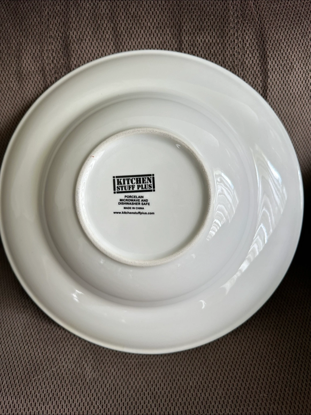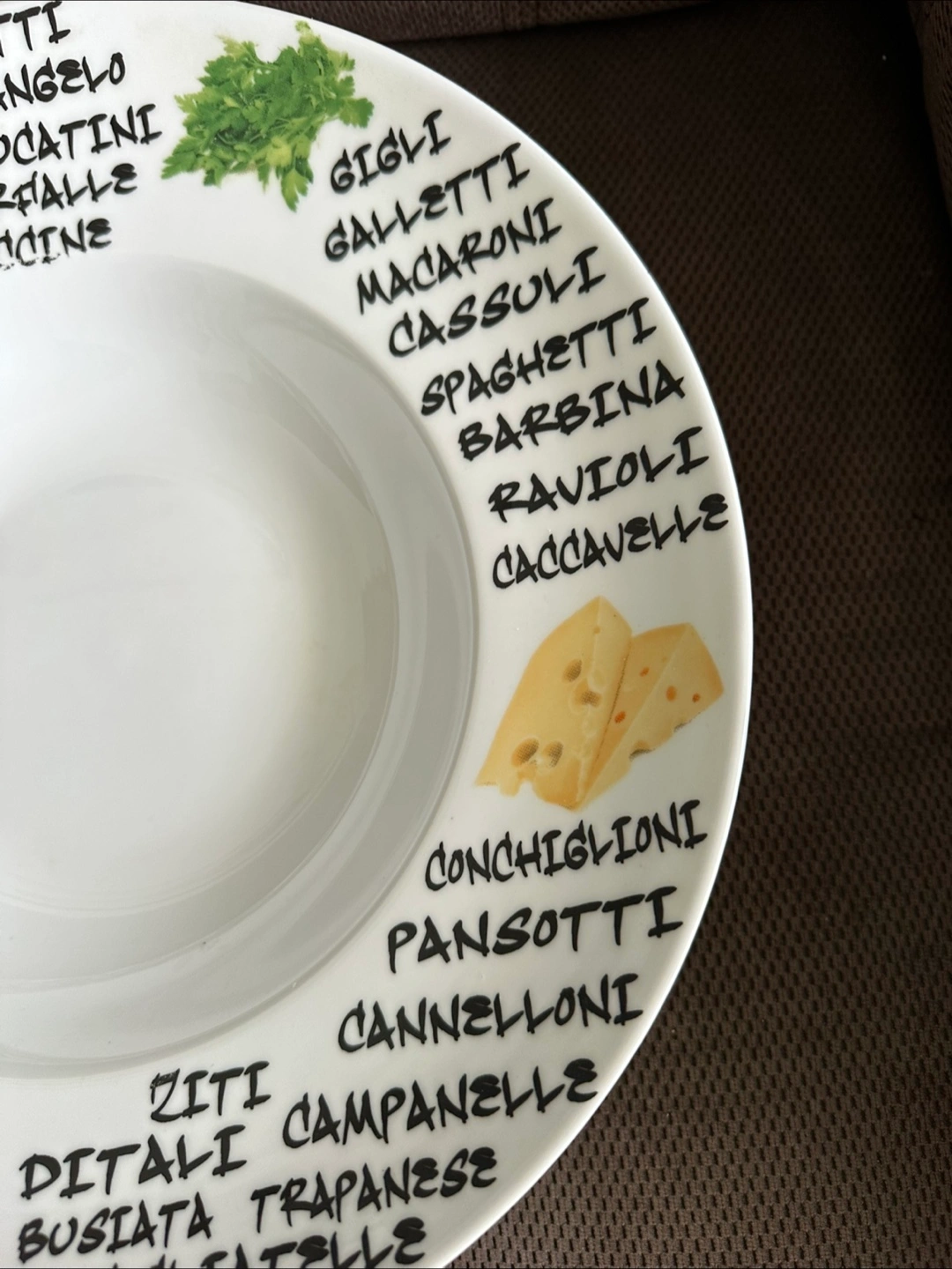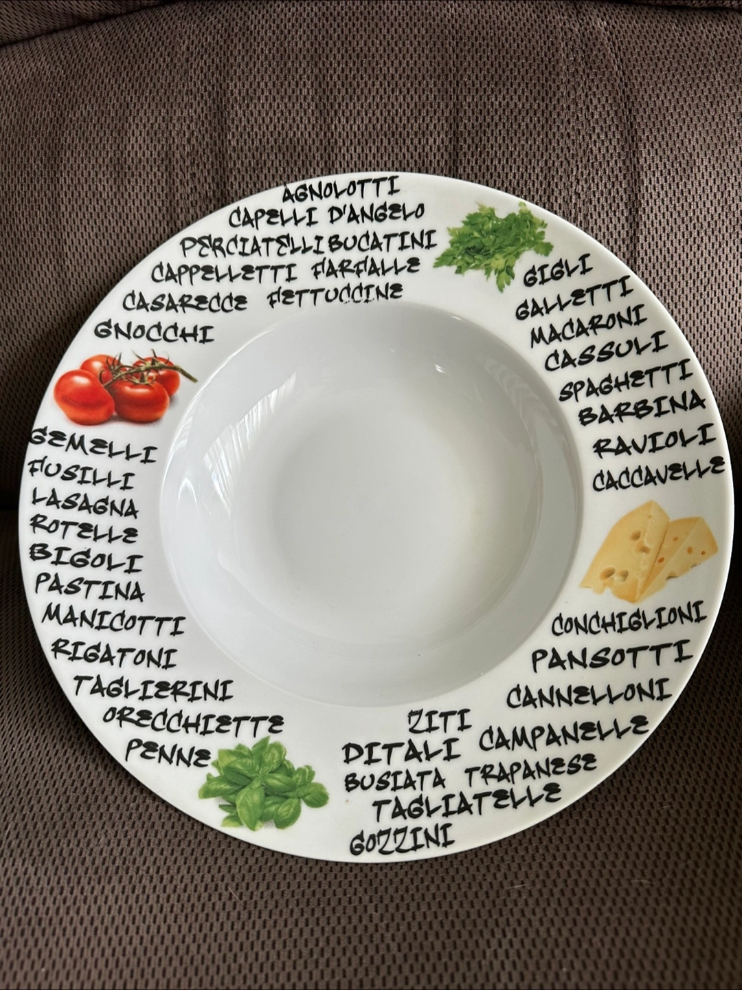 White pasta serving bowl. The rim features pasta names. There are also illustrations of basil, tomatoes, and cheese. Use it for pasta night to set a calm mood. No chips, stains or cracks, used once. kitchen cupboard clean out. Smoke free home.
