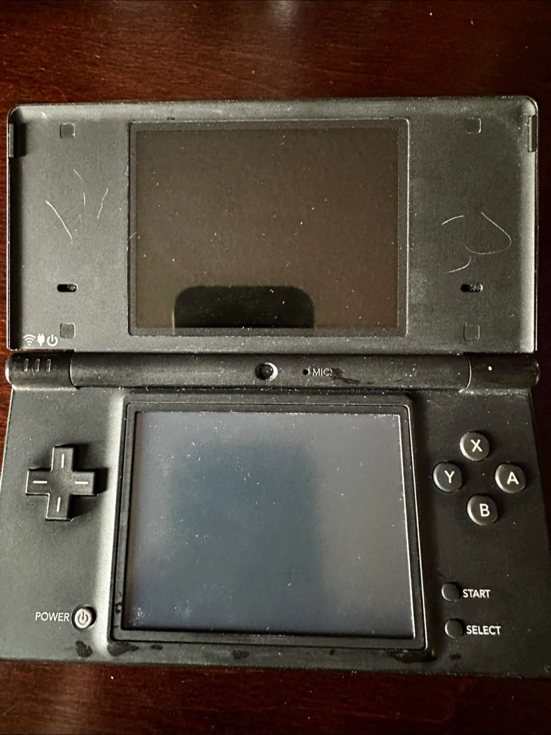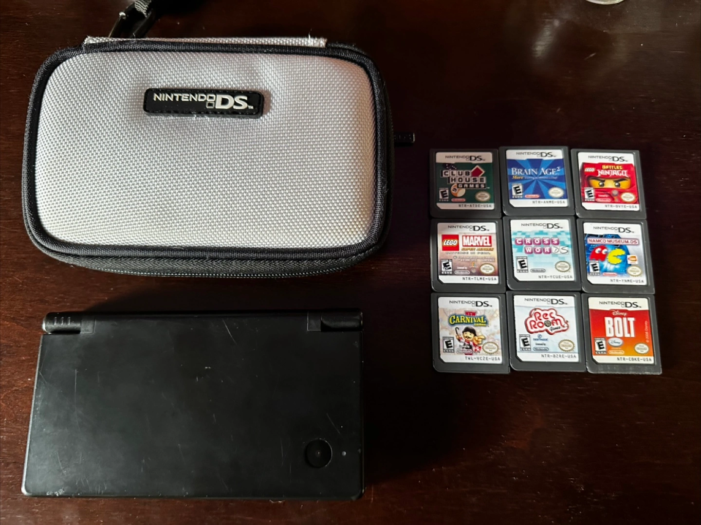 Black Nintendo DSi console with multiple games. Includes a carrying case, charger and stylus. New screens and digitizer.