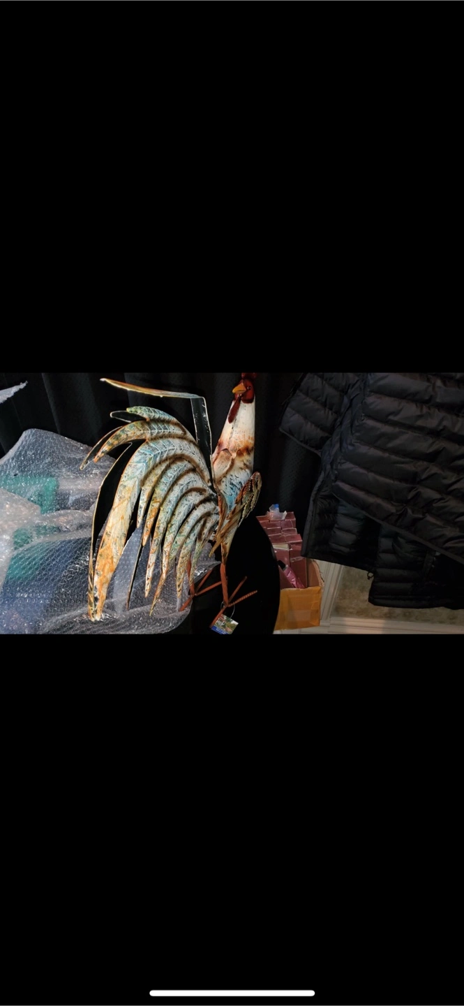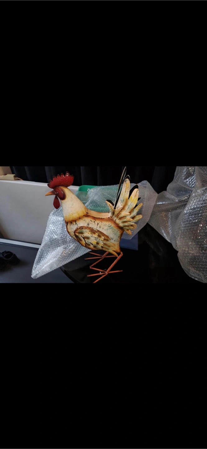 Metal rooster figurine. Features a red comb and wattle. Painted details on the body and feathers. Such a charming decorative addition to a space will bring a sense of peace.