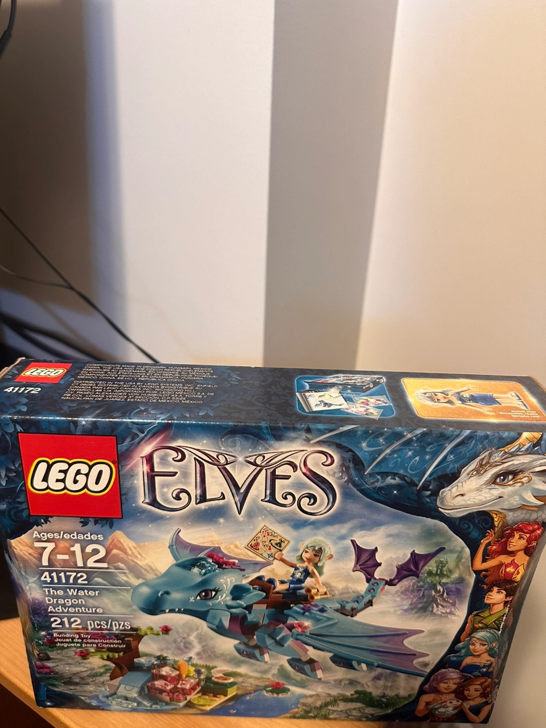 A set of LEGO Elves. Depicting a blue dragon and a minfigure. This toy could be the perfect activity to unwind with after a long day.