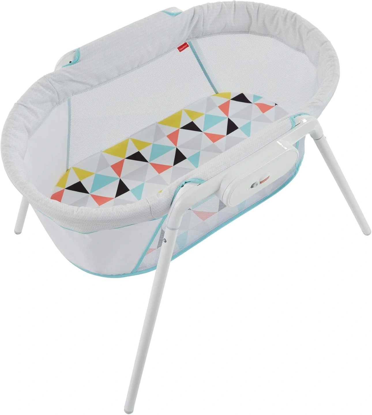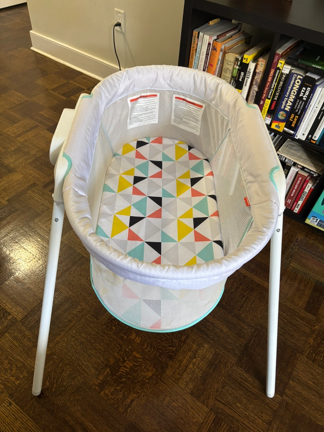 Oval shaped bassinet. Features a patterned mattress, mesh sides, and a white frame. Easy to fold for storage. Smoke, pet free home Cash only. Pick up: Tyndall Avenue and Thorburn Avenue All sells are final