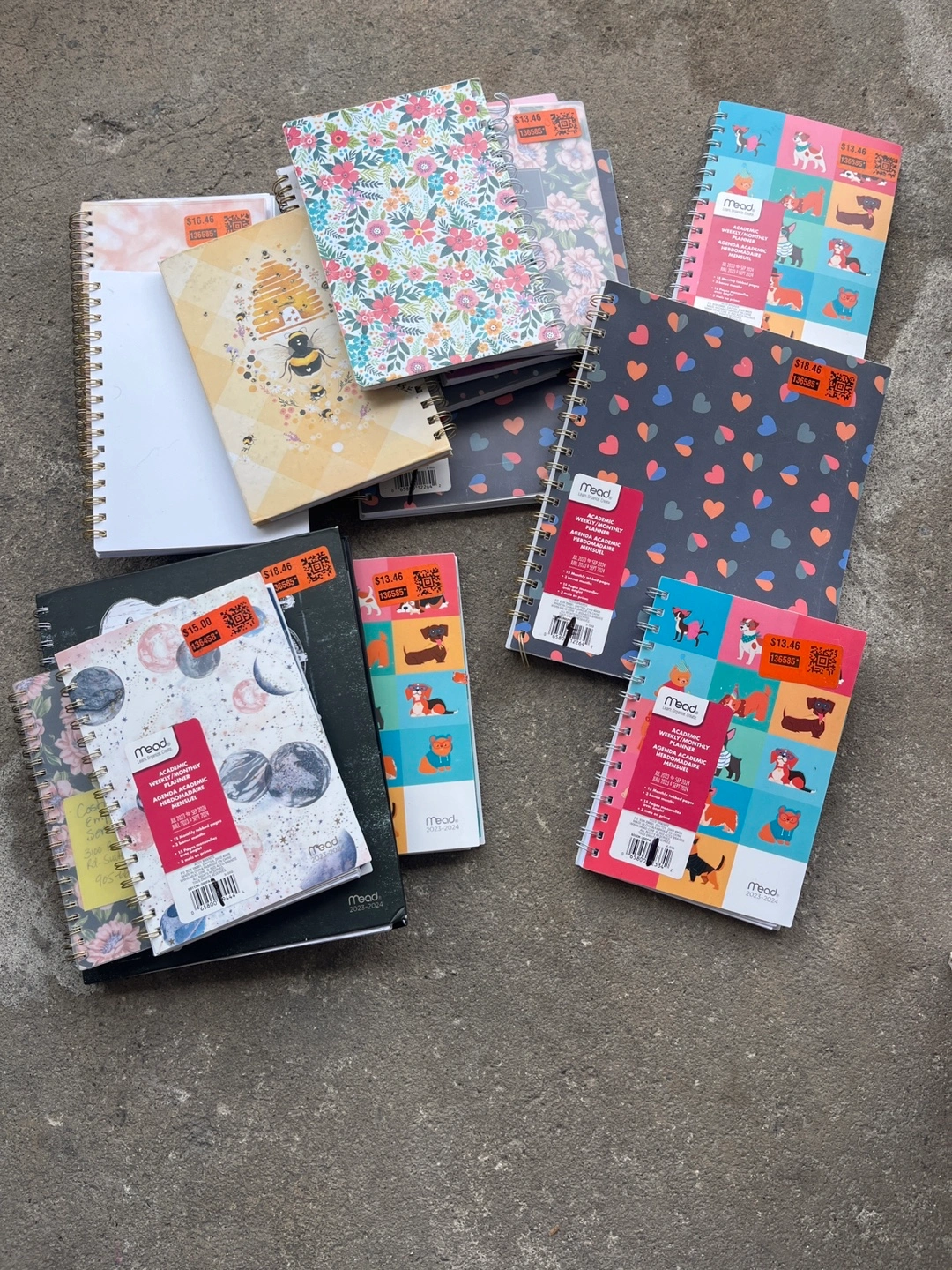 A collection of spiral notebooks with various covers. Some notebooks have floral, bee, heart, dog, and space designs. Keeping a journal can be an excellent way to reduce stress. # Freecycle