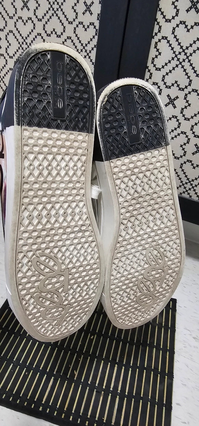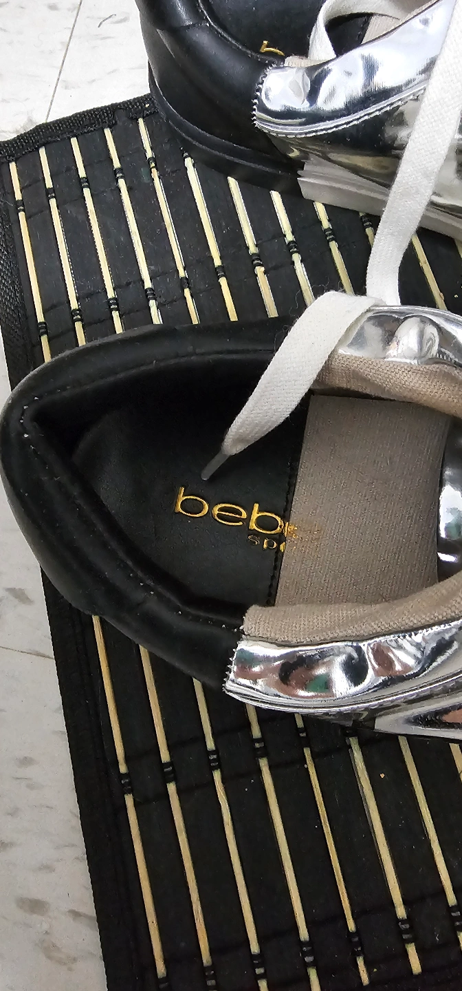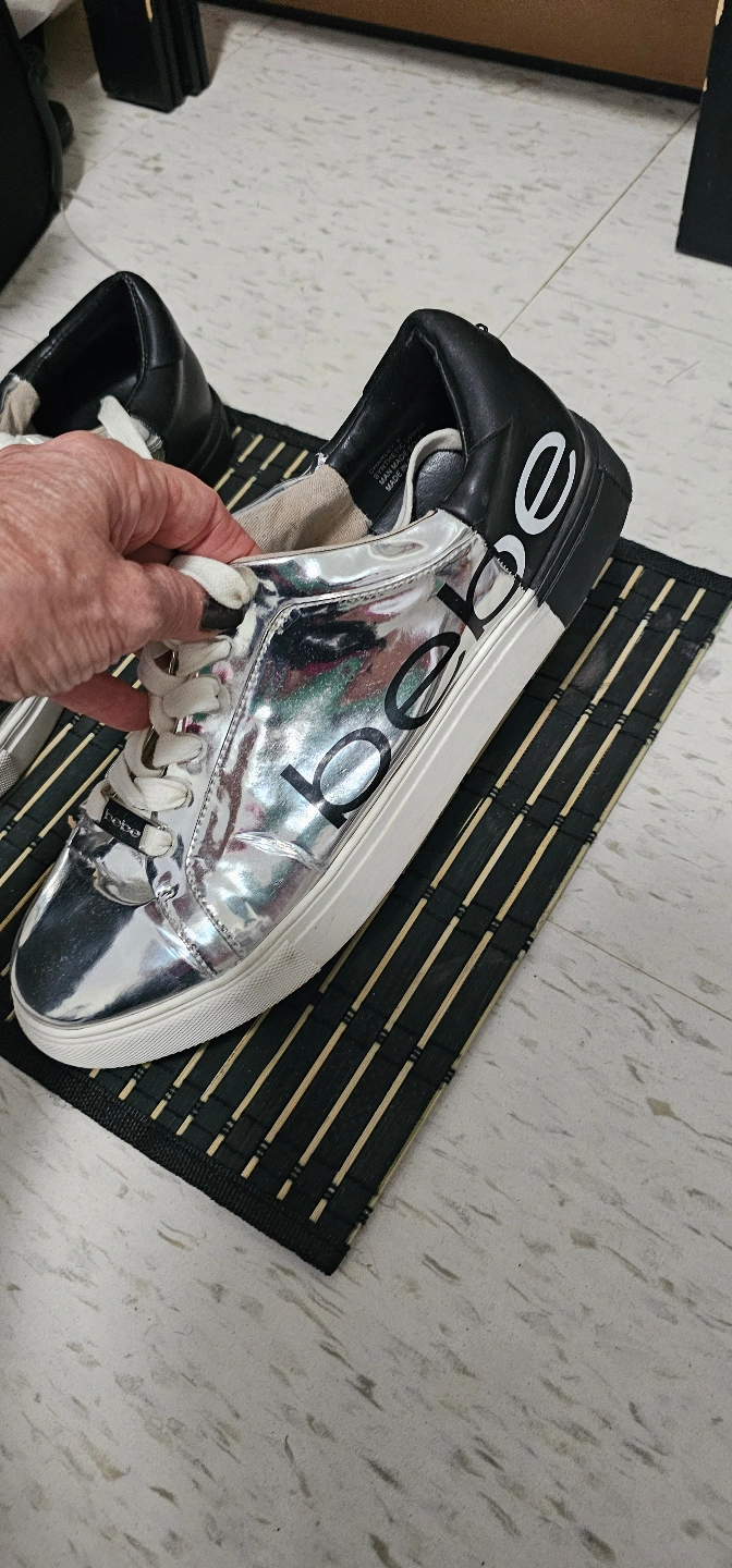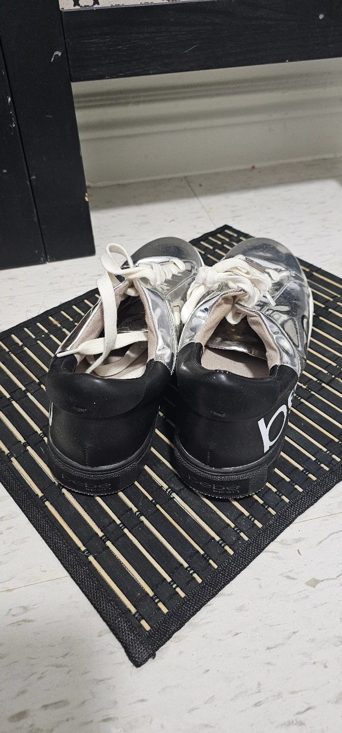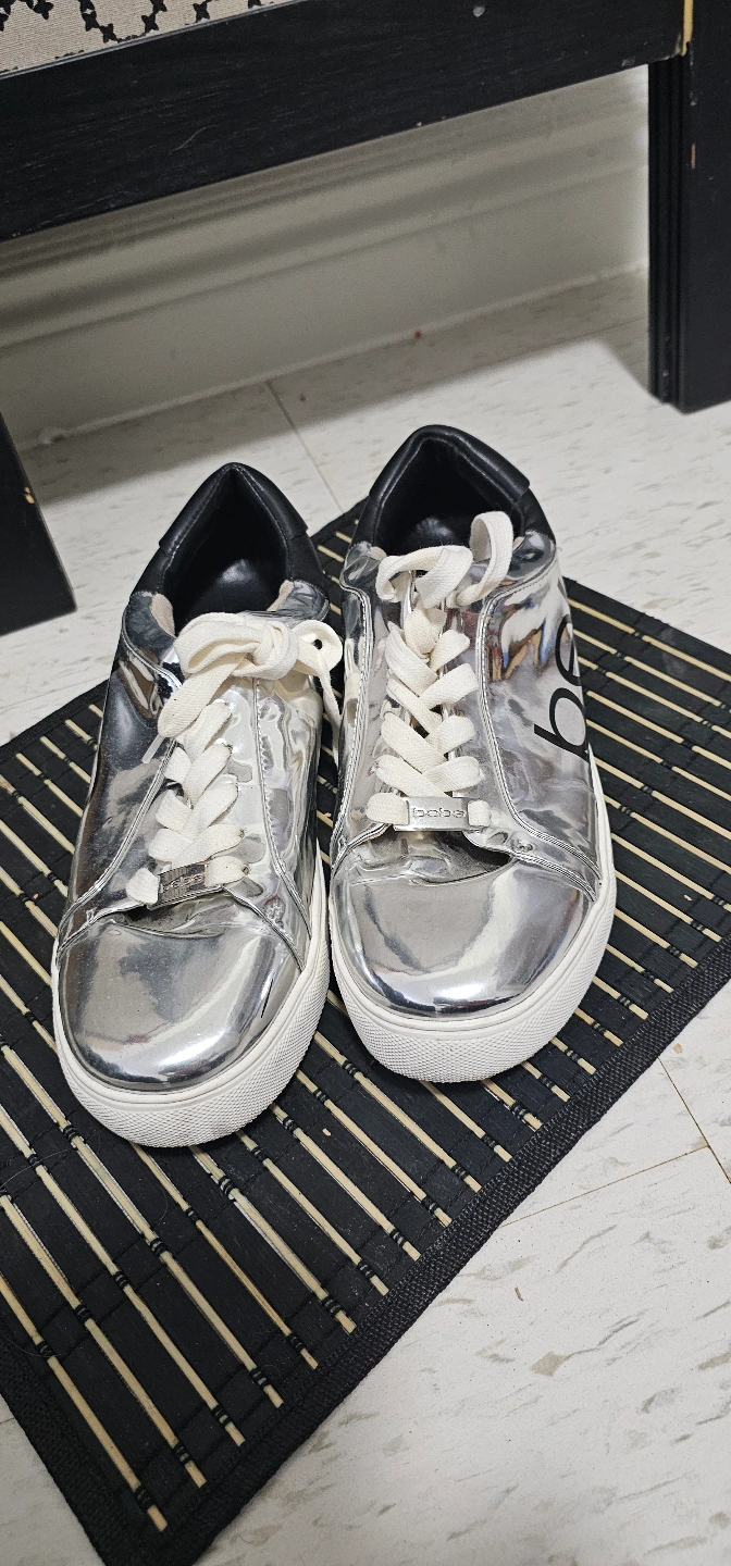 Metallic silver sneakers with black accents. White laces. Featuring white soles. They are an ideal item to add a pop of shine to any outfit.