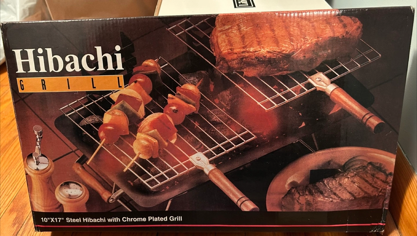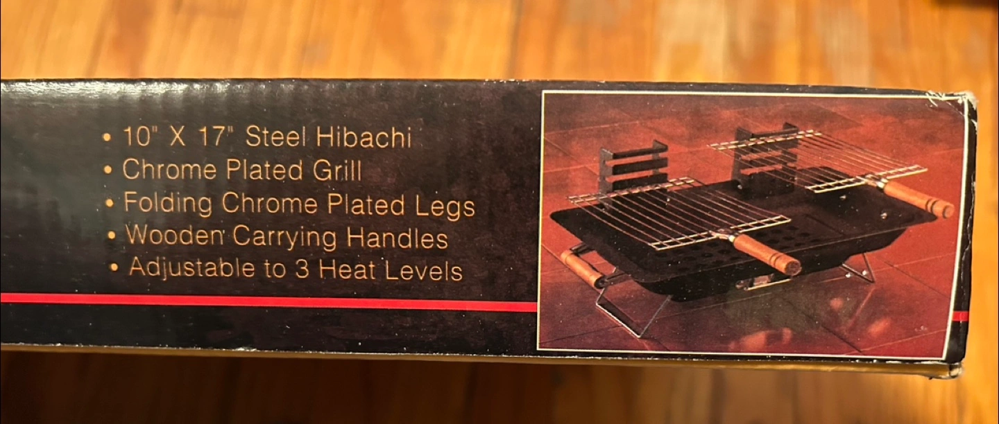 Hibachi grill with chrome plated grill and folding legs. Features wooden carrying handles. Adjustable to 3 heat levels. Enjoy a delightful meal cooked on this grill.