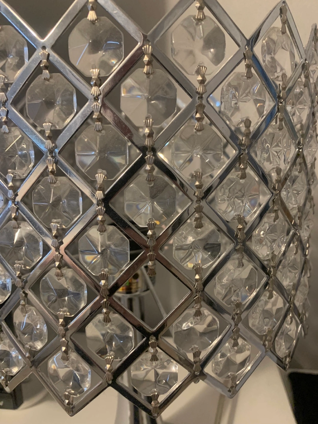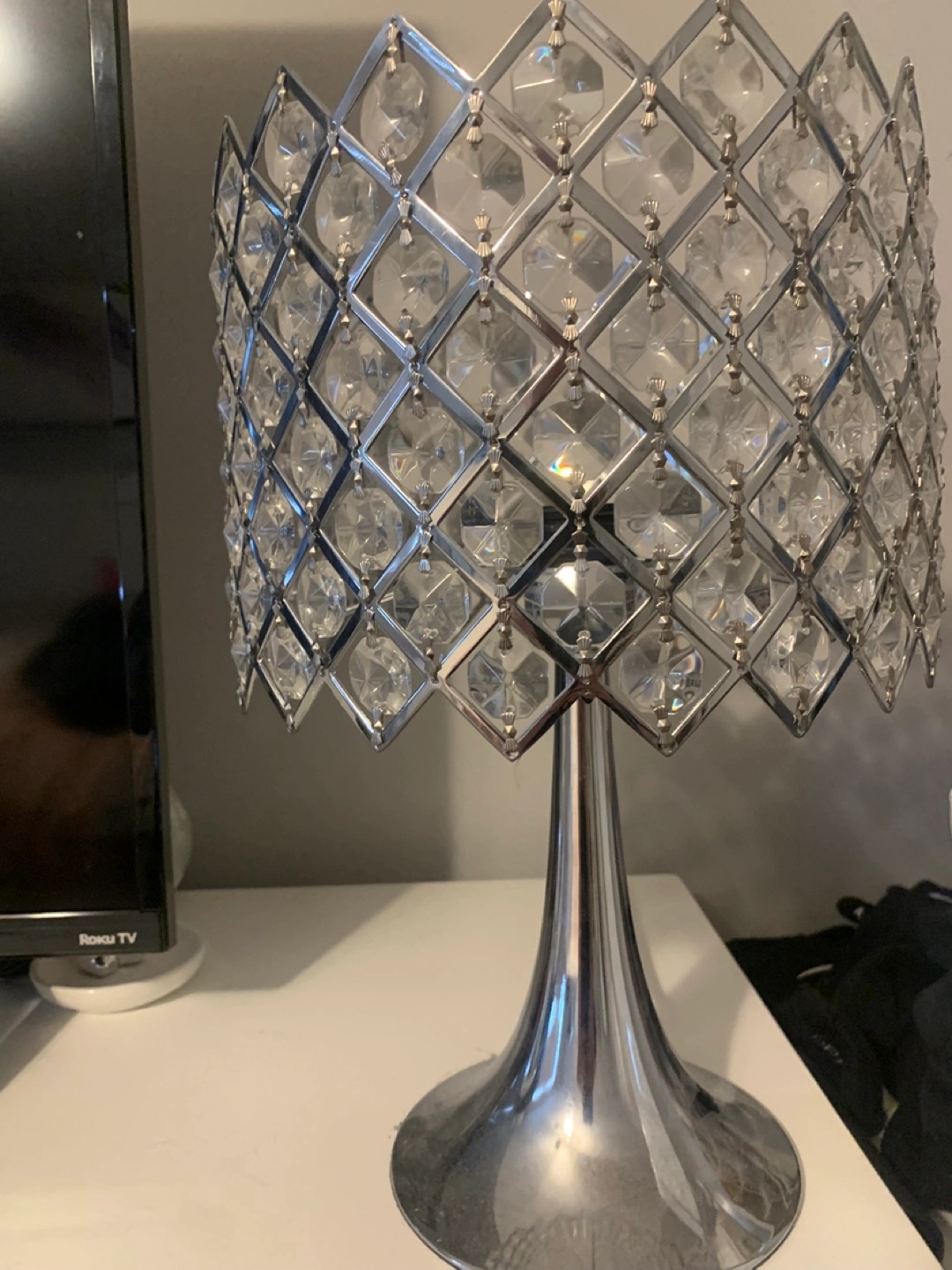 Silver table lamp with a diamond design. Crystal accents throughout. A perfect piece to create a relaxing ambiance in any space. One crystal missing at back- see picture