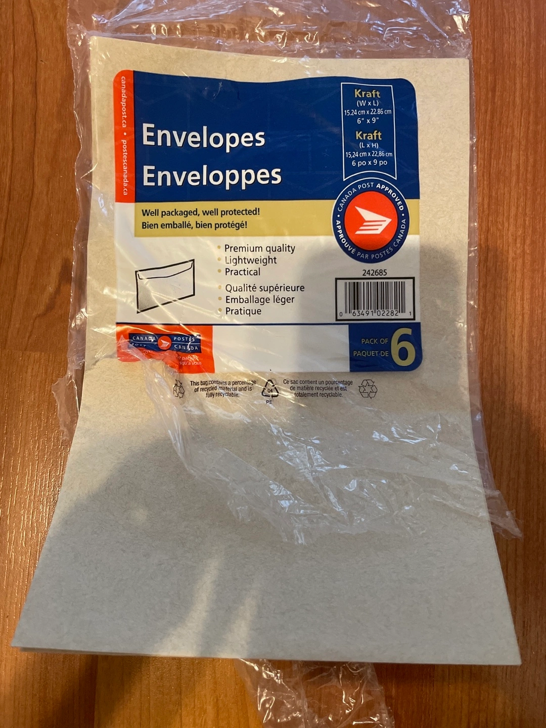 Kraft envelopes - 22.9 cm by 30.5 cm - pack of 6 Purchased from Canada Post Still have 4 envelopes Size and quantity: Each envelope measures 22.9 cm by 30.5 cm (9 in. by 11 in.), suitable for a variety of mailing purposes. Pickup only Cash only
