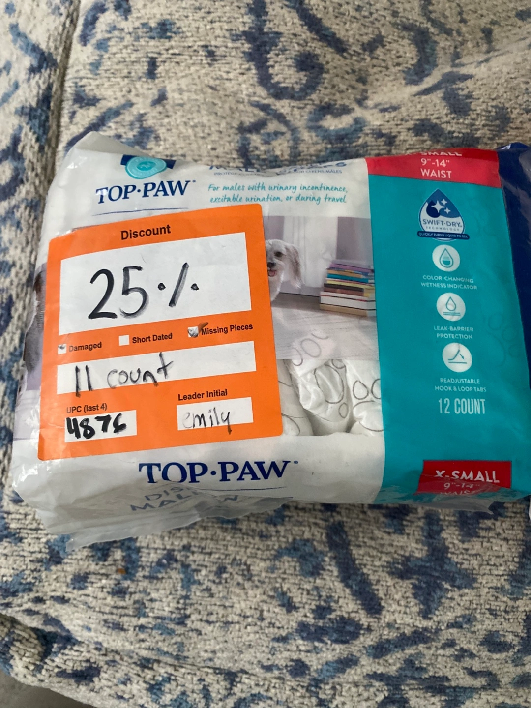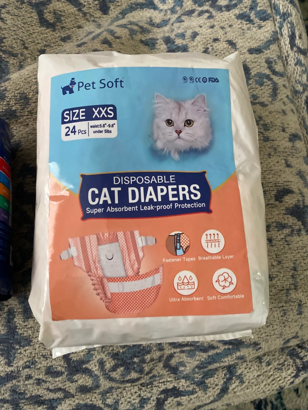 Several packages of cat diapers. One is for cats, and the other is for dogs The package of male diapers has a discount sticker on it. Perfect for a less stressful pet-owning experience.๐ฅ